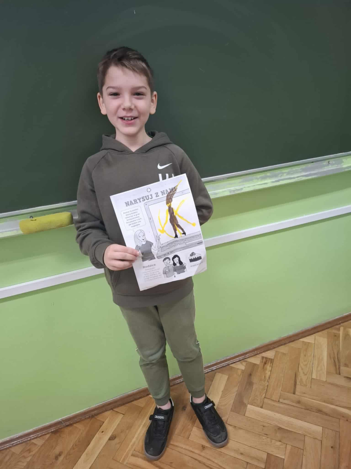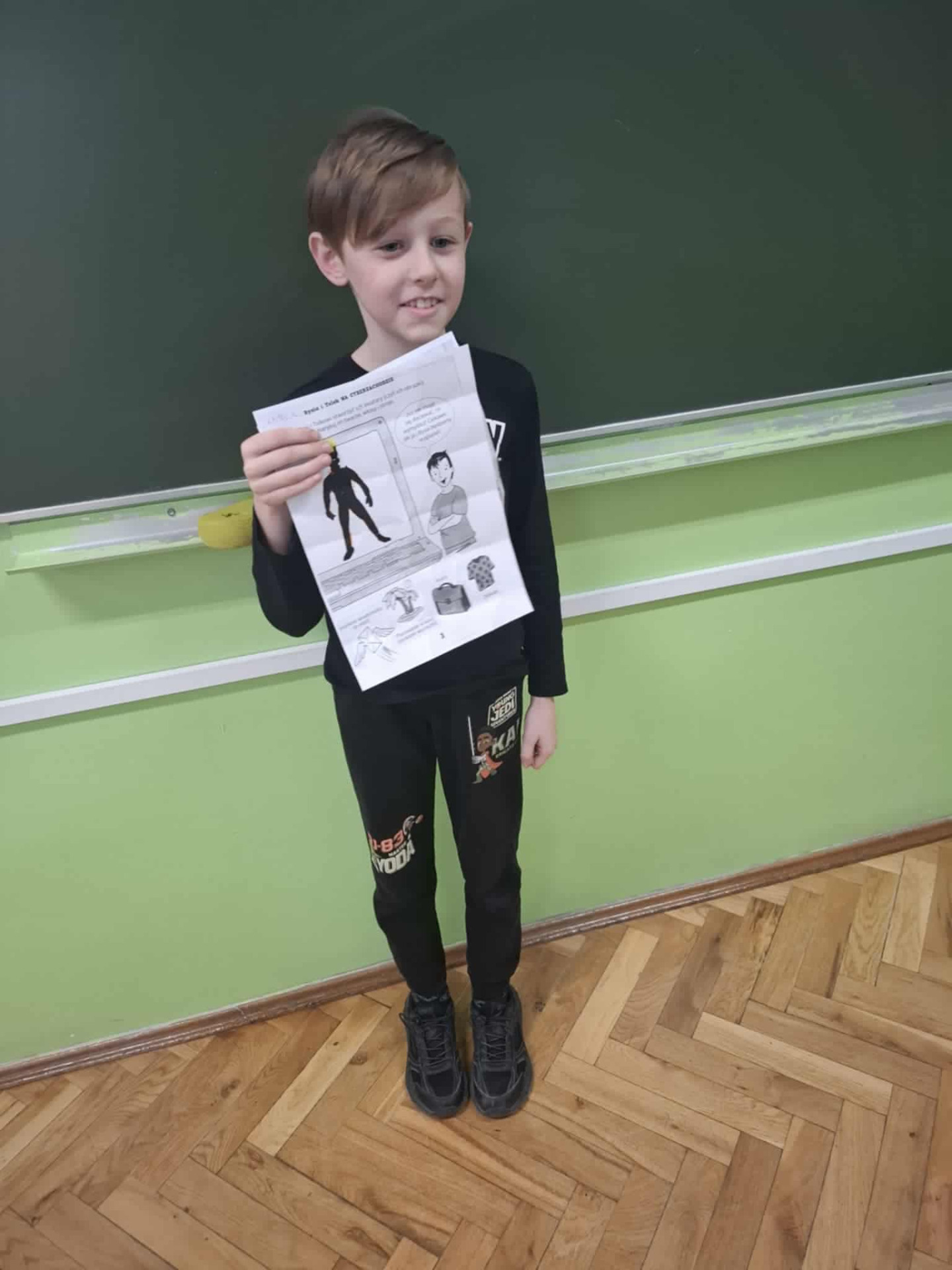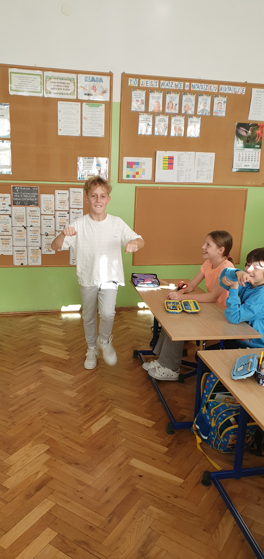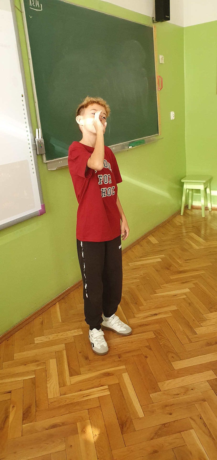 Gra w kalambury. Uczeń prezentuje frazę "drink - pić".