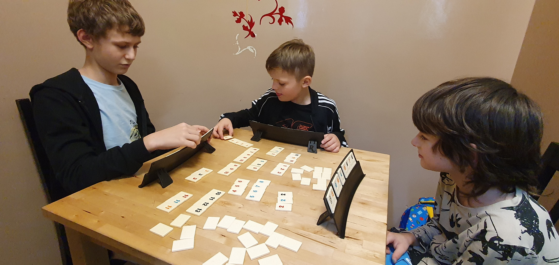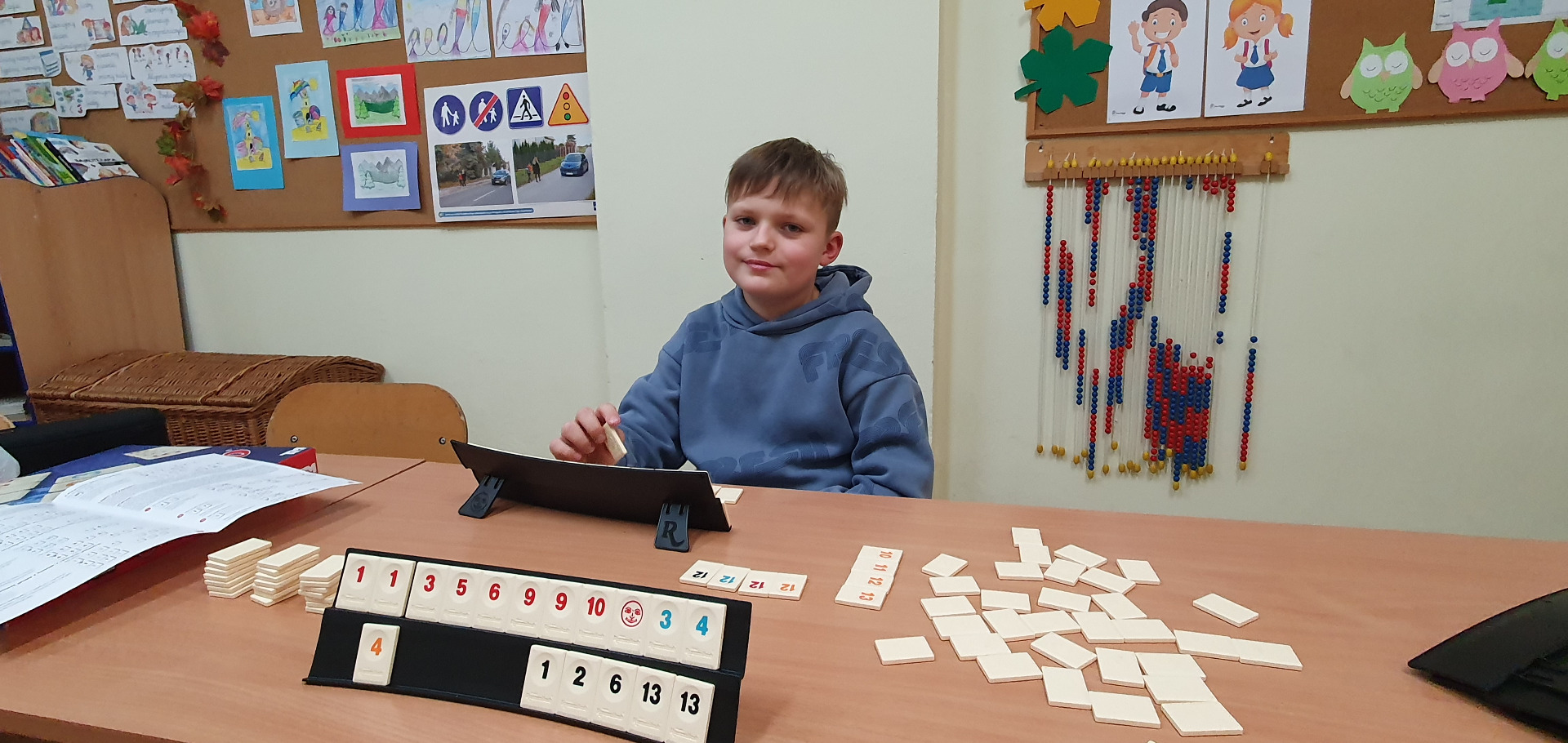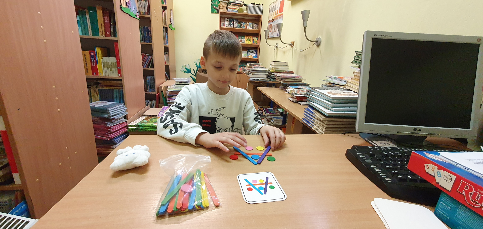 Uczeń układa wzór z patyczków i kółek przedstawiony na wylosowanym kartoniku.
