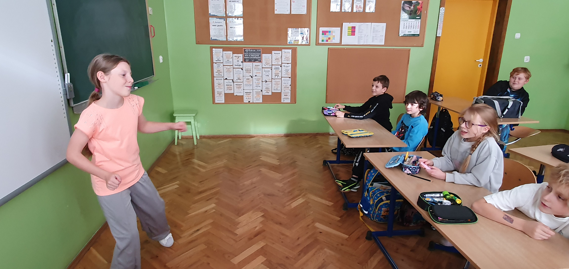 Gra w kalambury. Uczennica prezentuje frazę "dance - tańczyć".