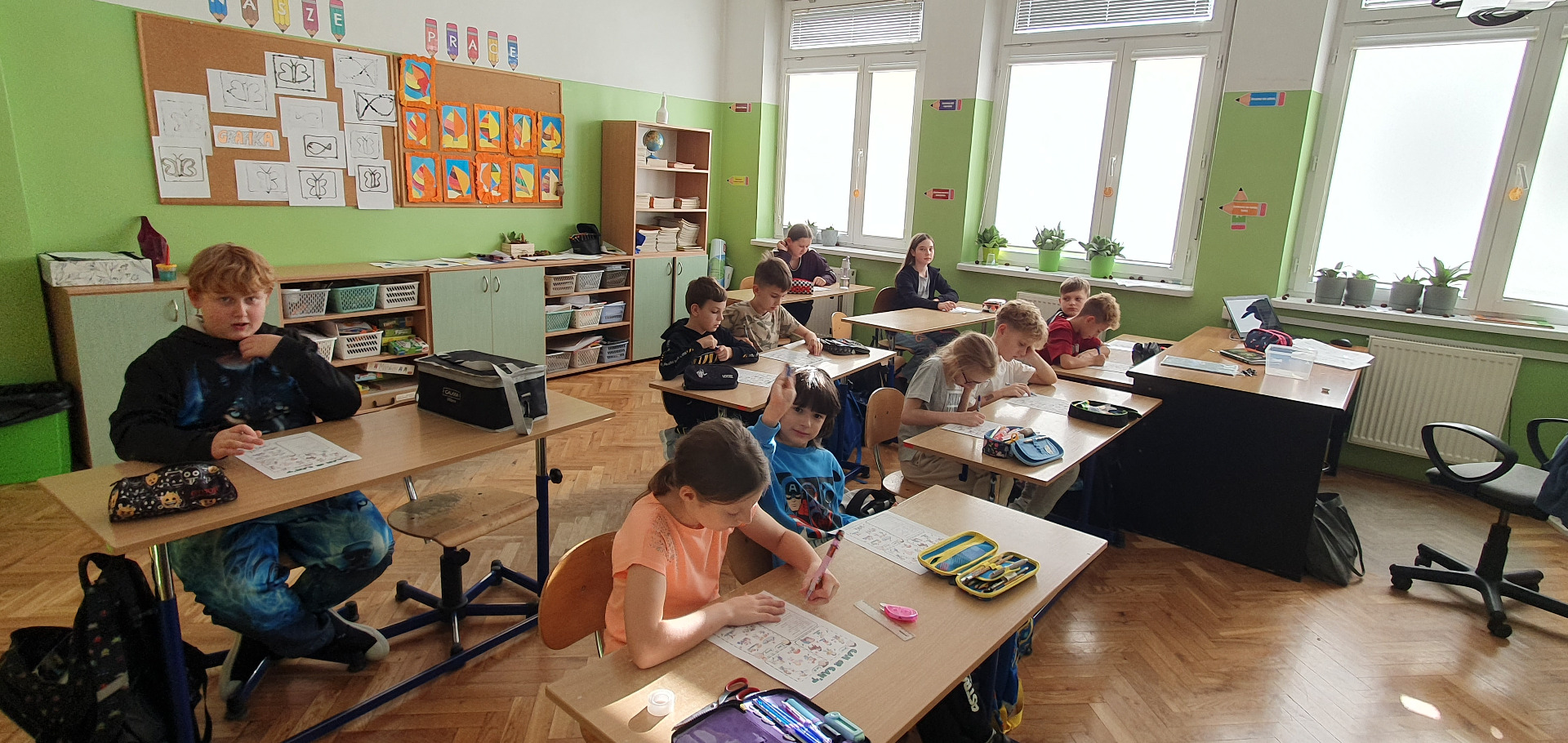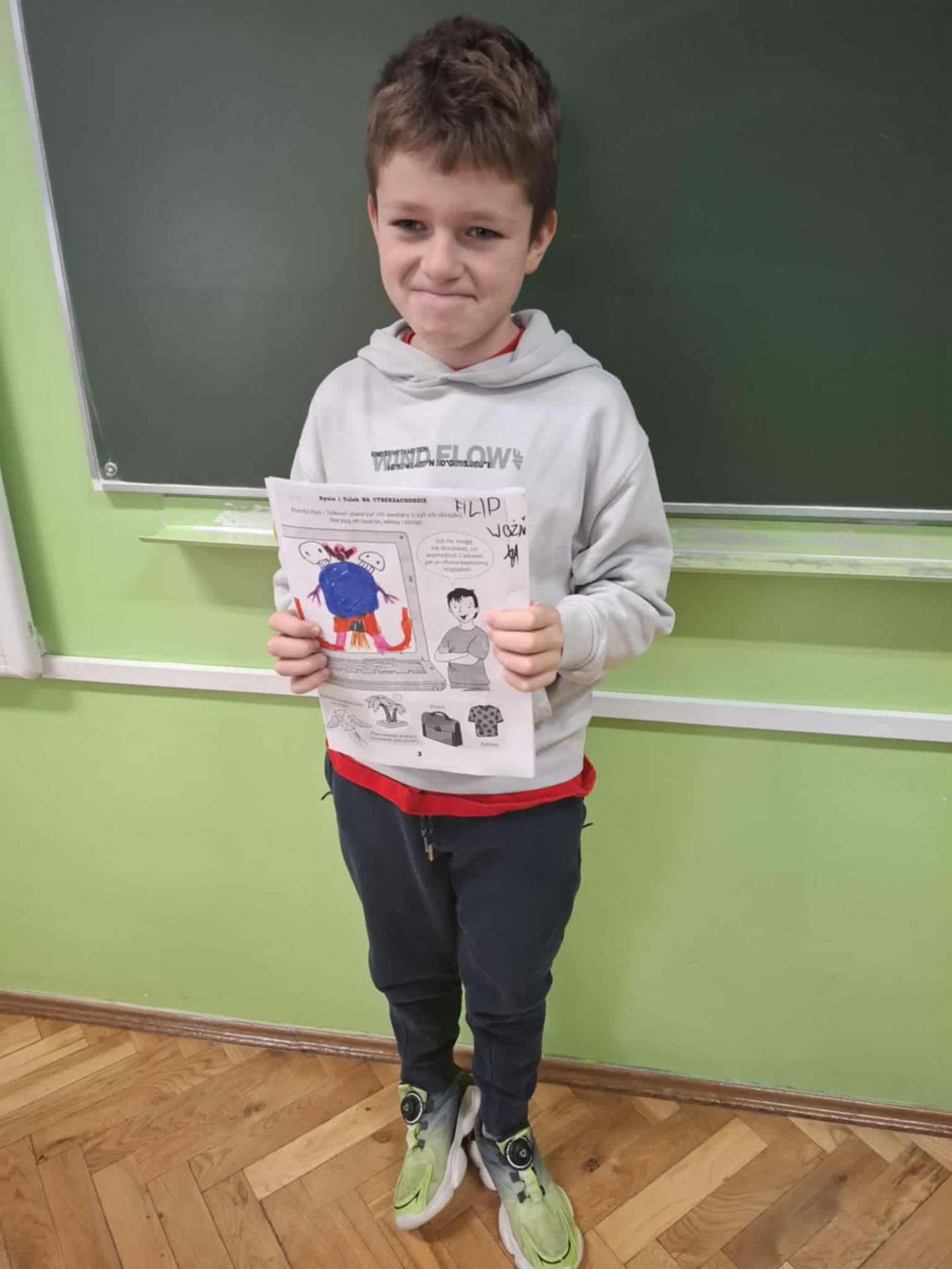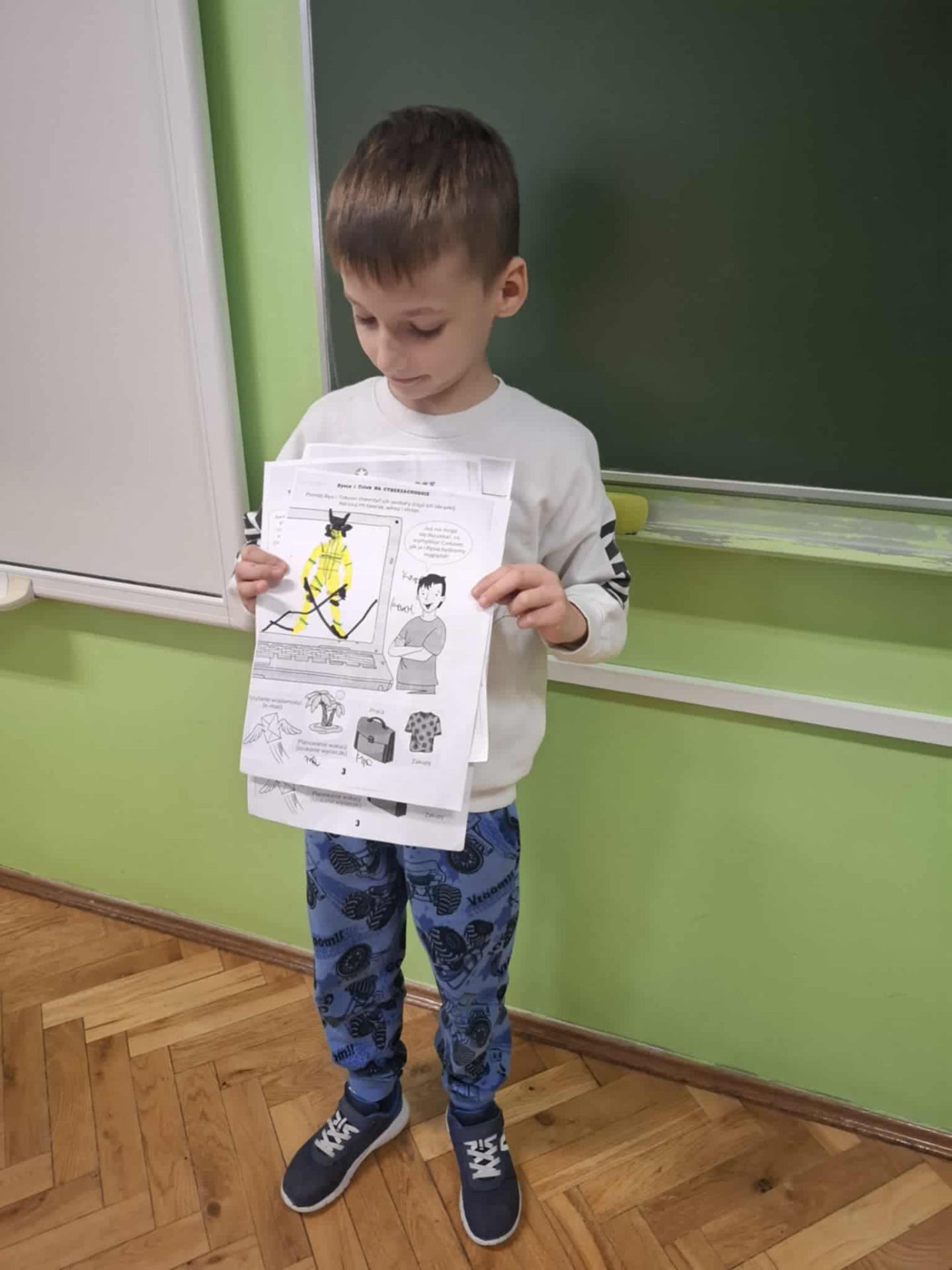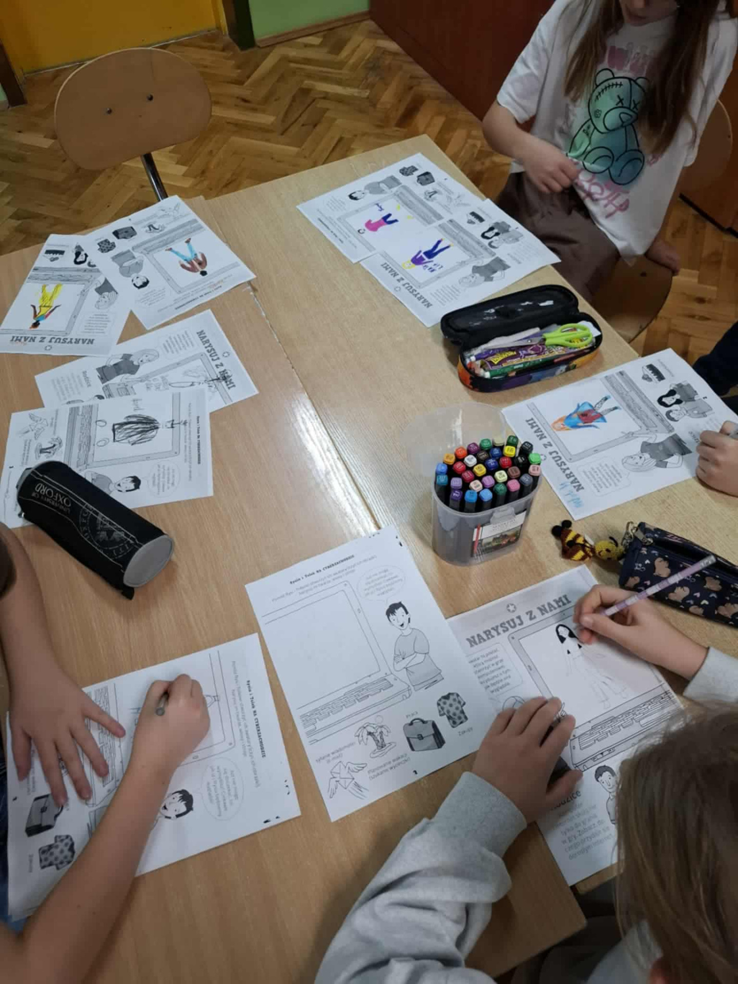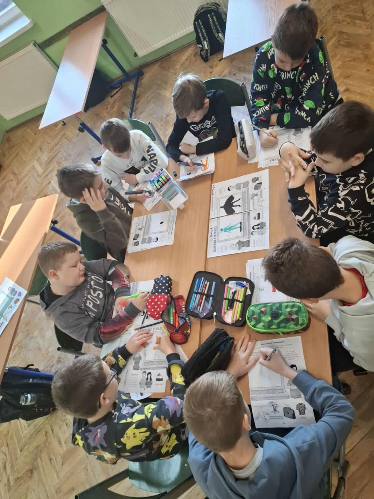 Uczniowie klasy III siedzą wspólnie przy stolikach i tworzą swoje awatary.