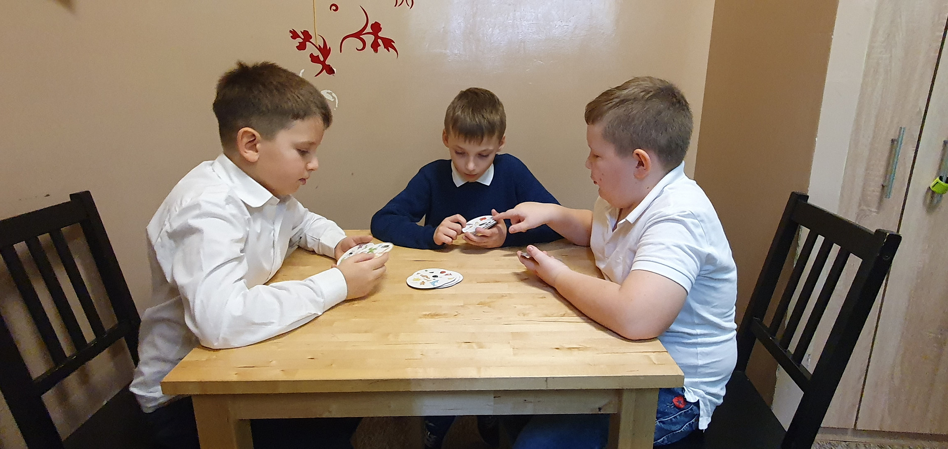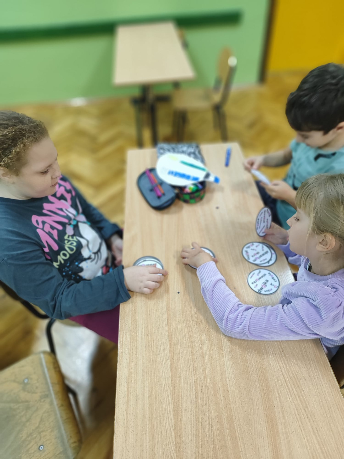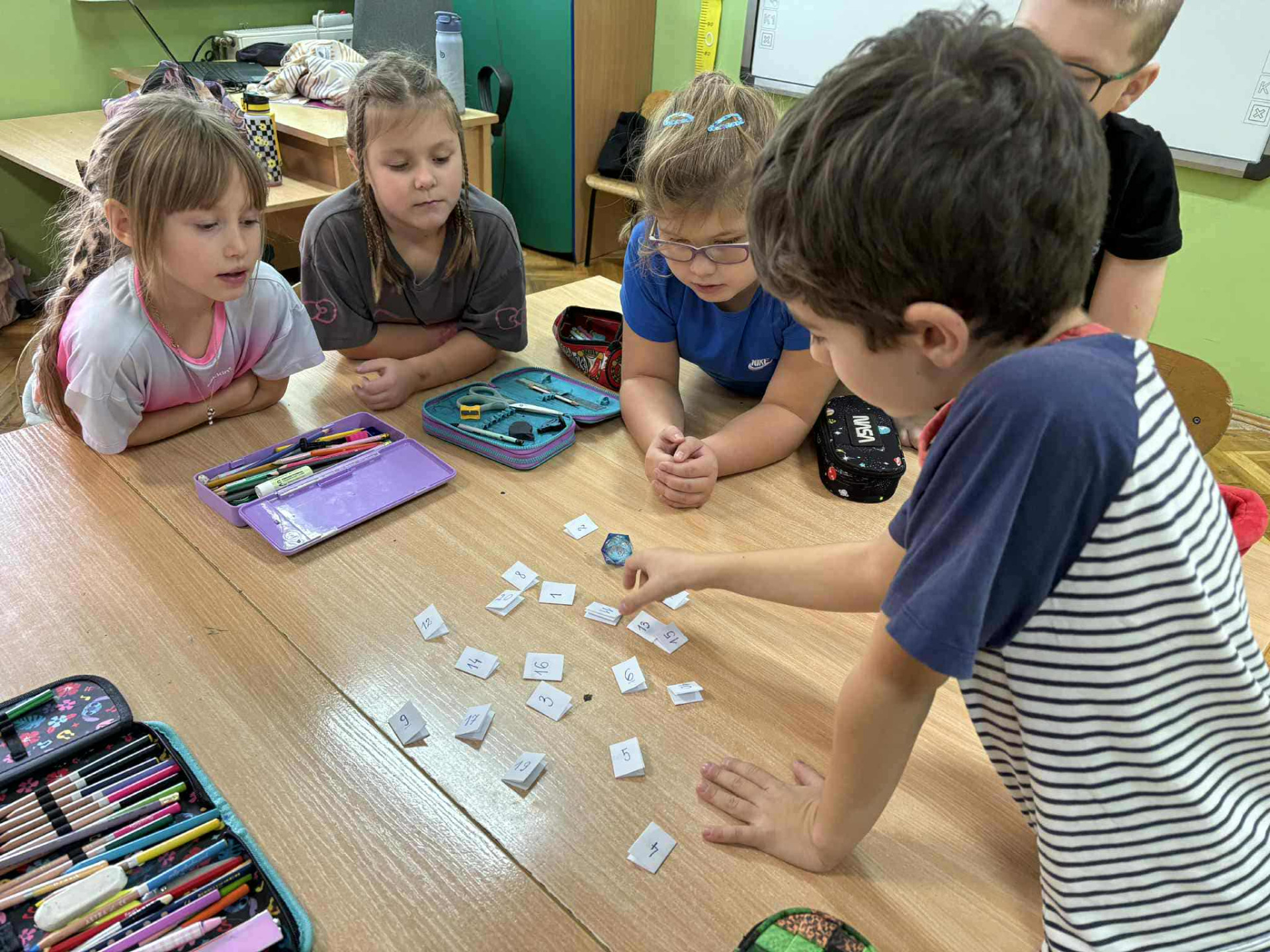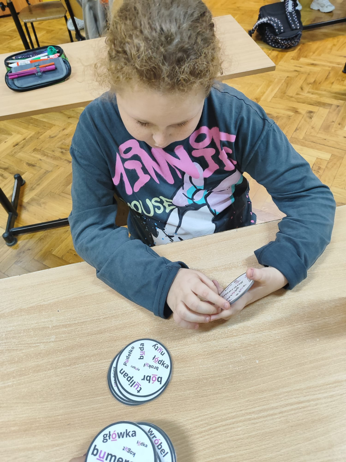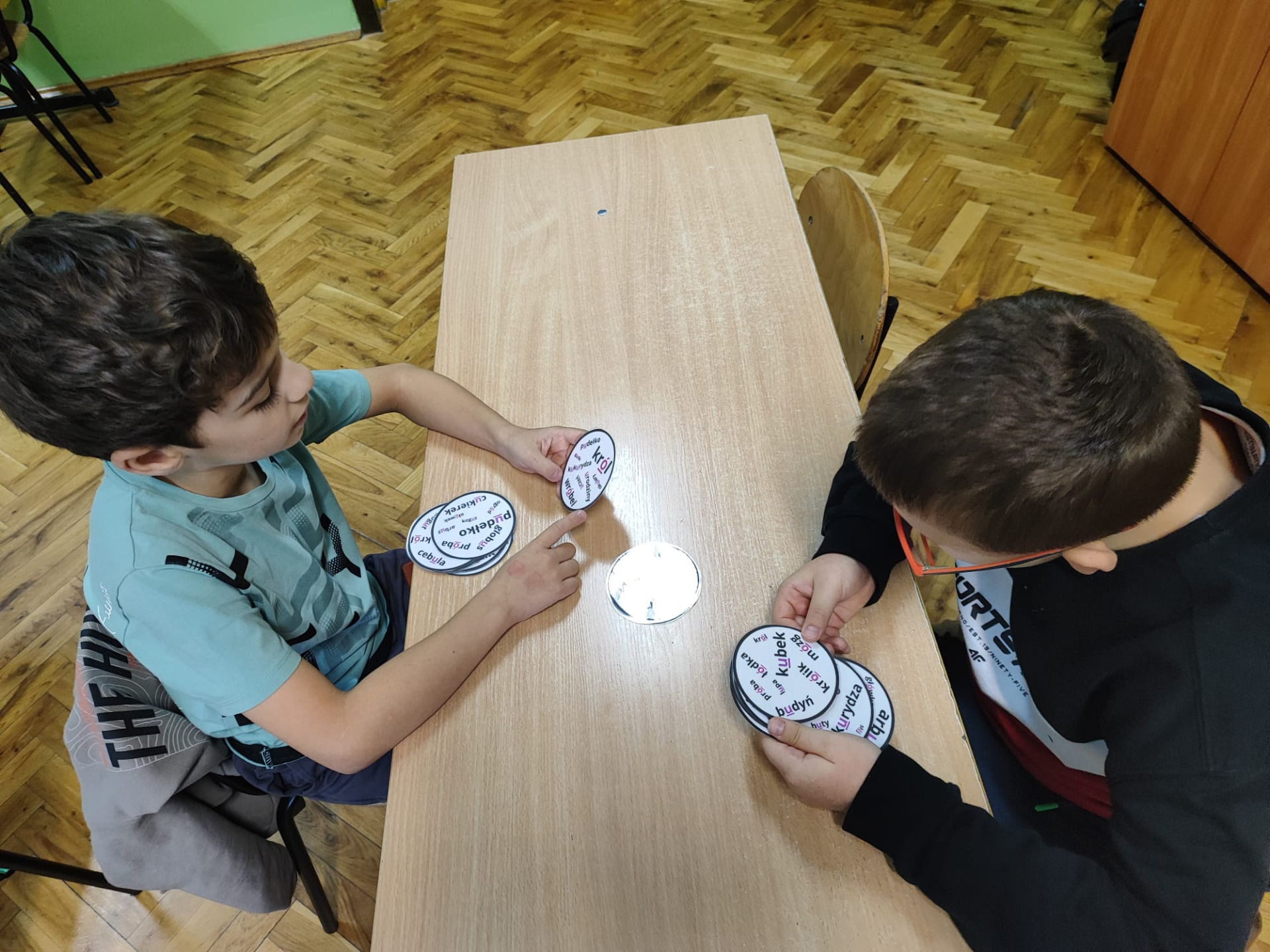 Uczniowie klasy II grają w Dobble ortograficzne.
