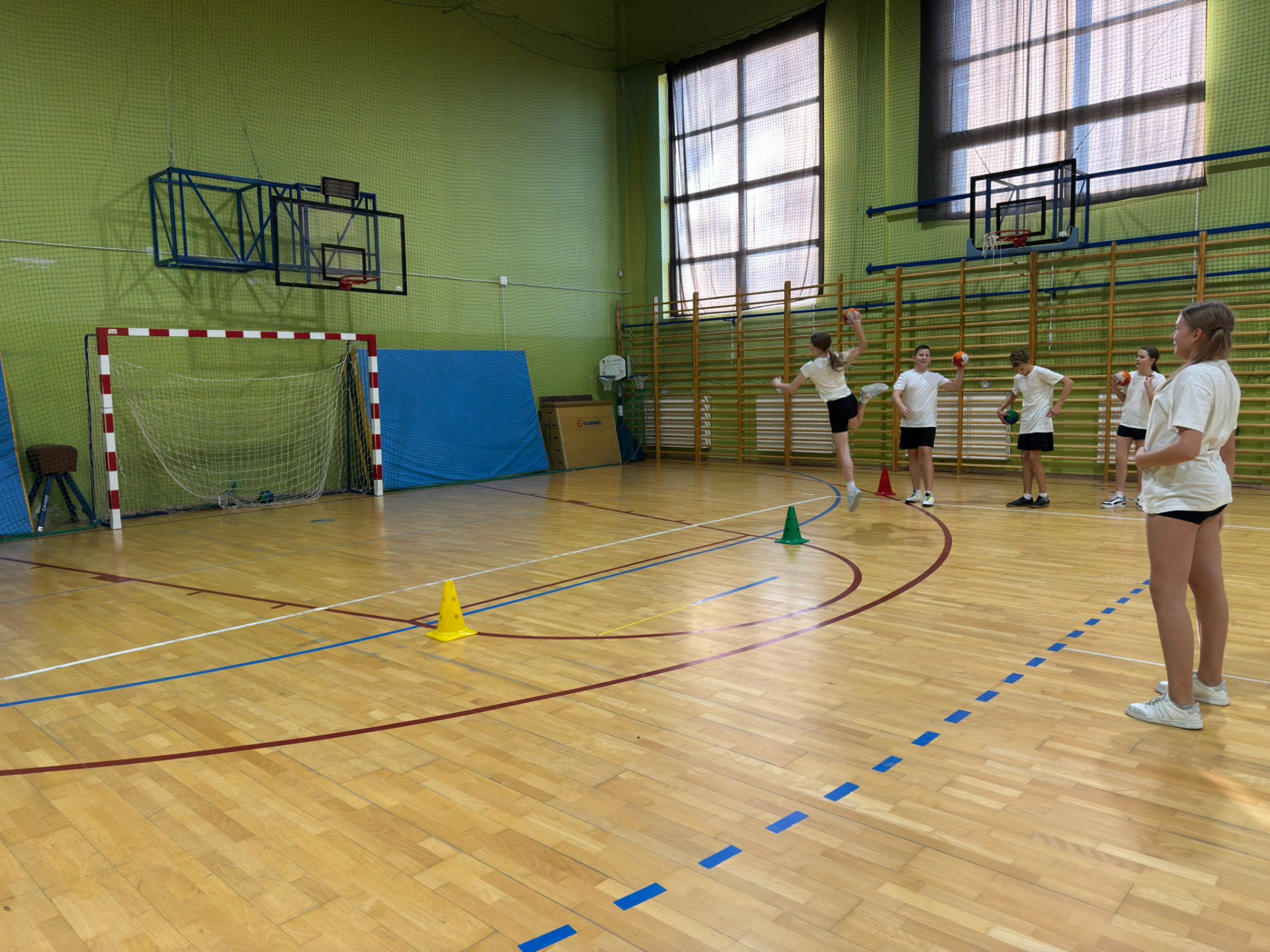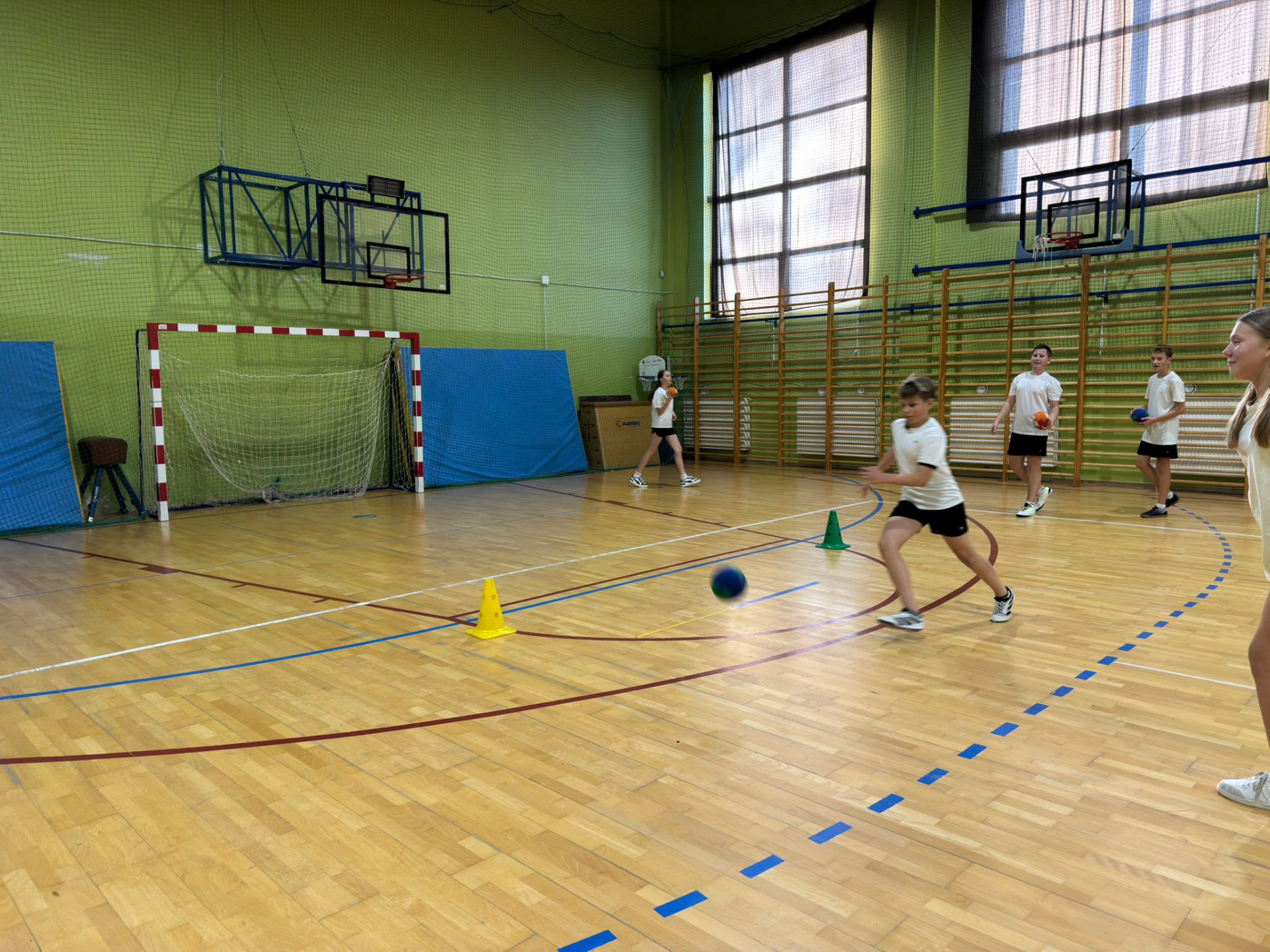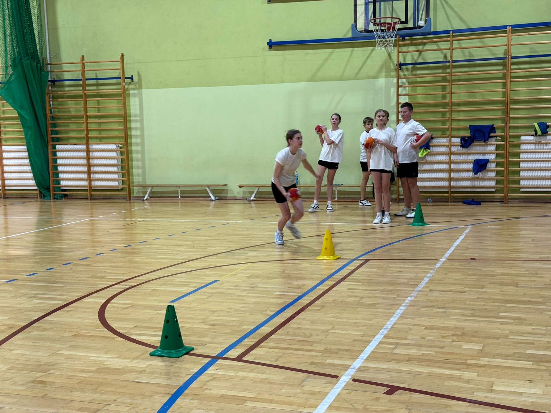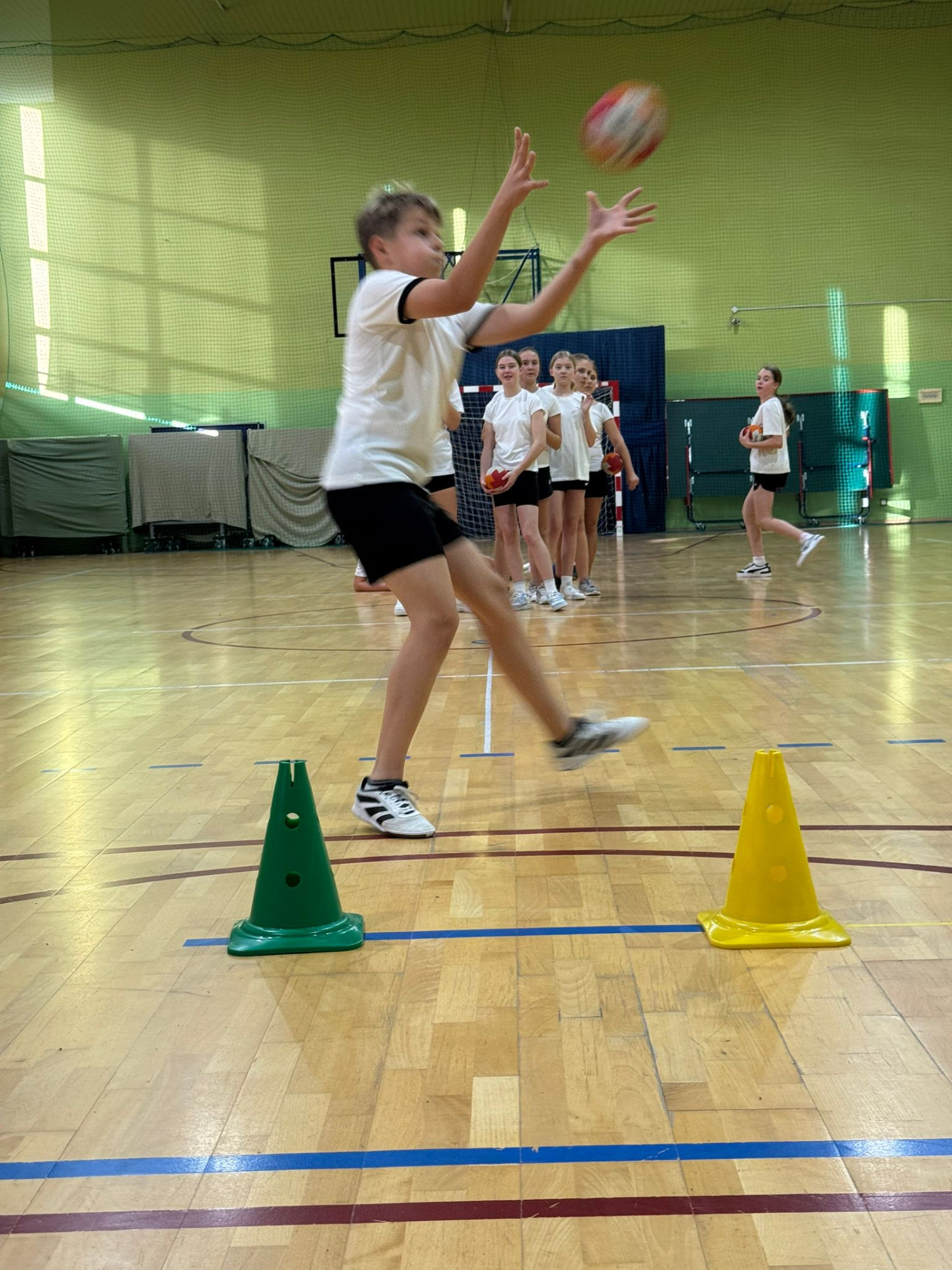 Uczeń łapie piłkę podczas wykonywania zadań na torze przeszkód.