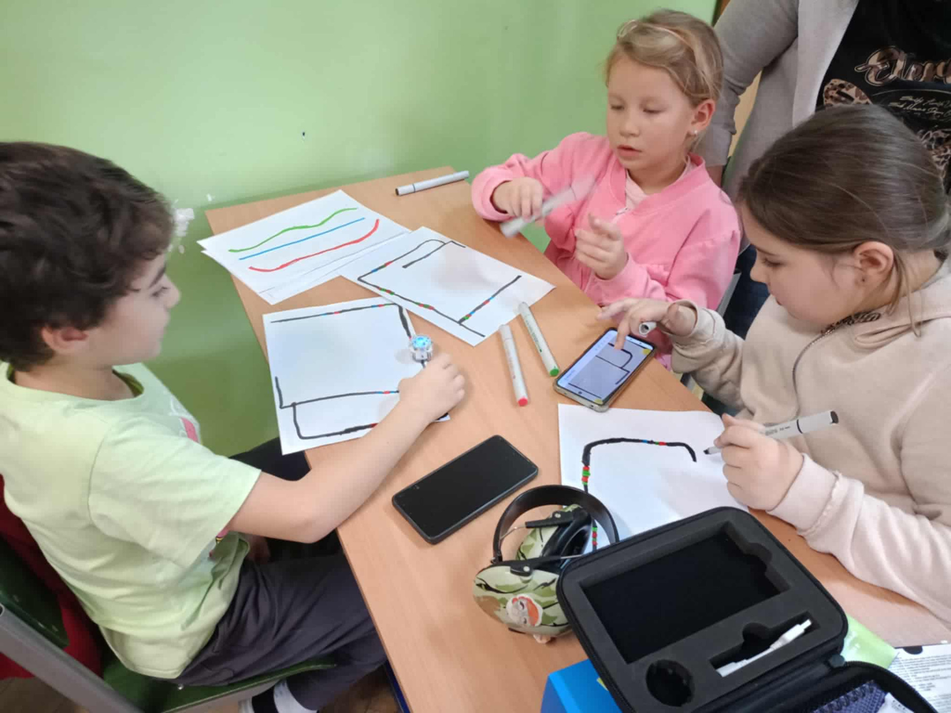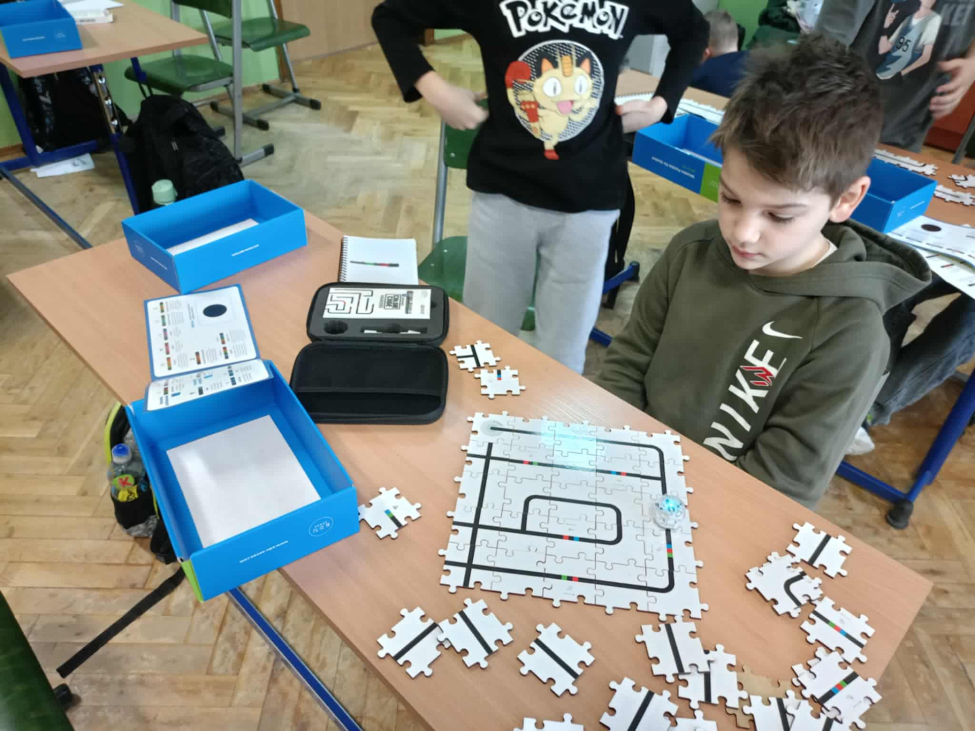 Uczniowie tworzą trasę dla robota.