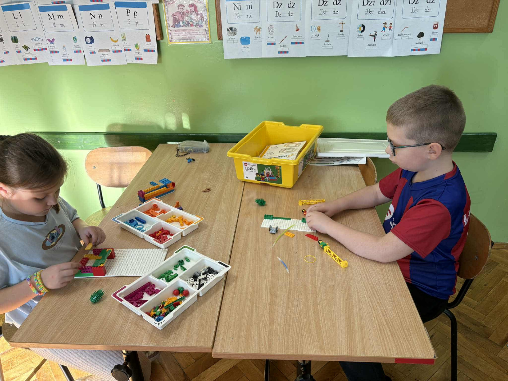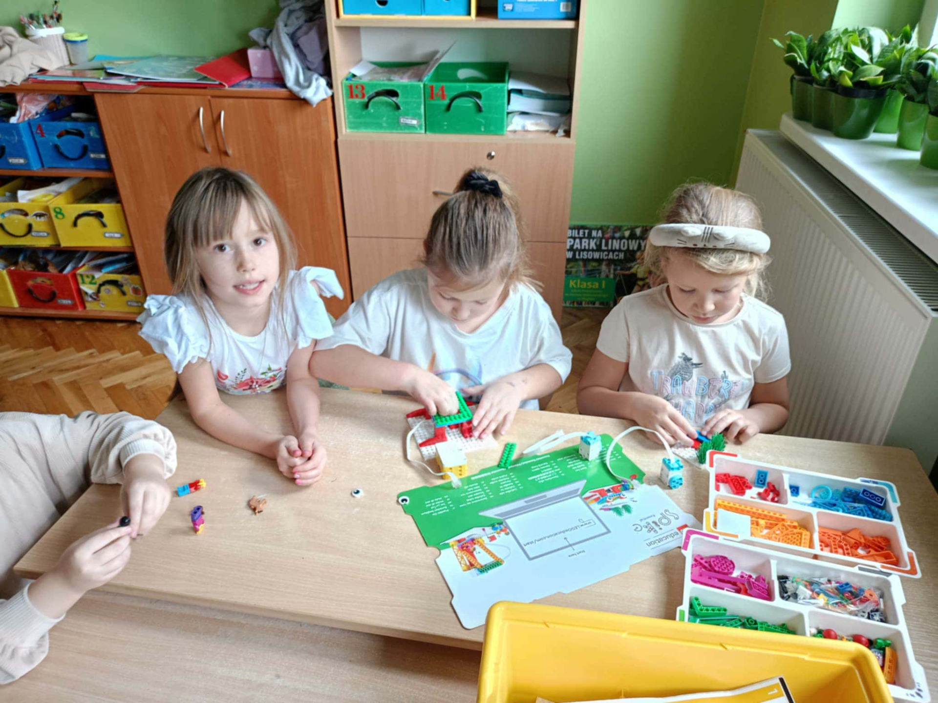 Uczennice budują konstrukcje z klocków według kolorowej instrukcji.