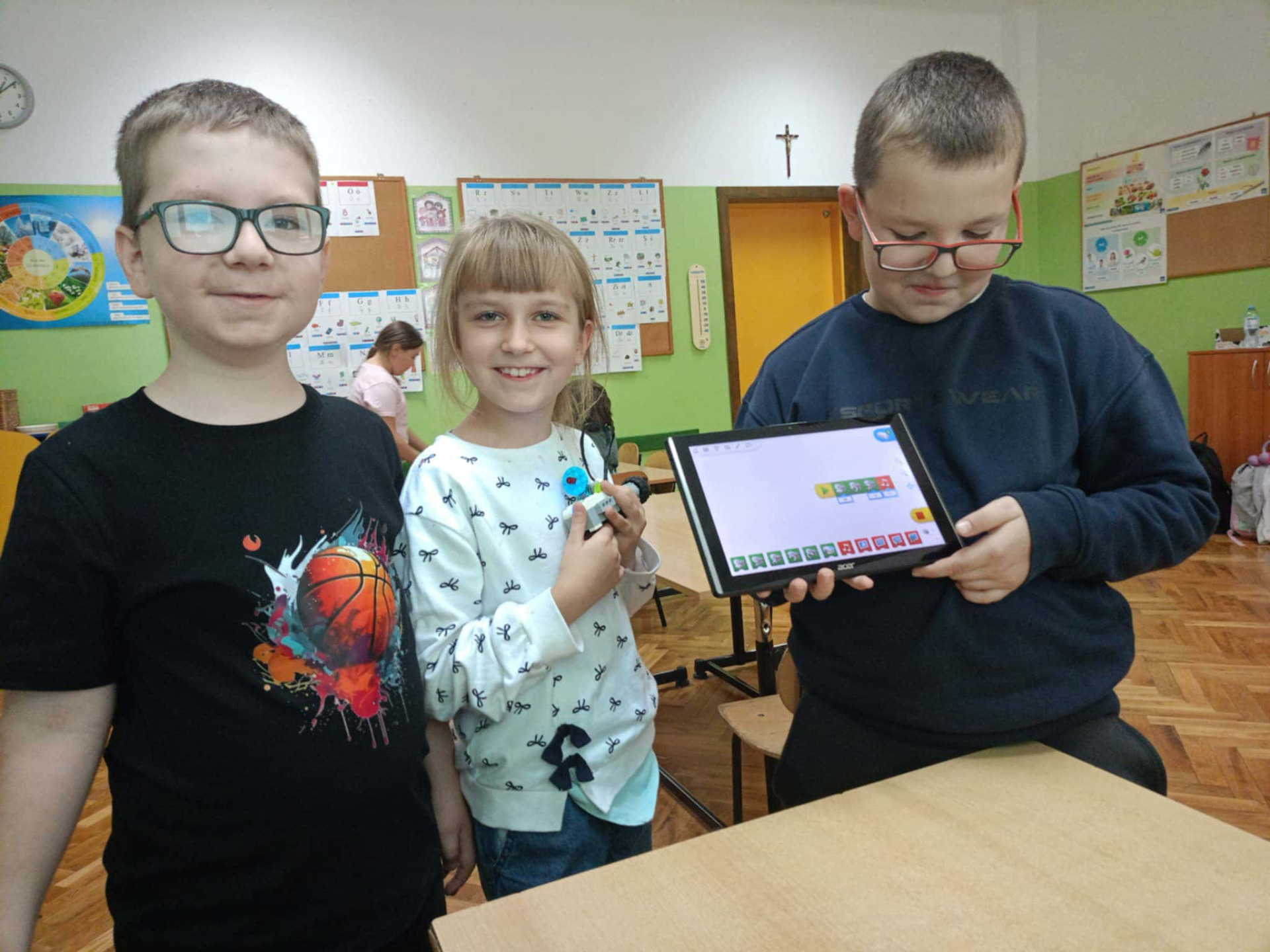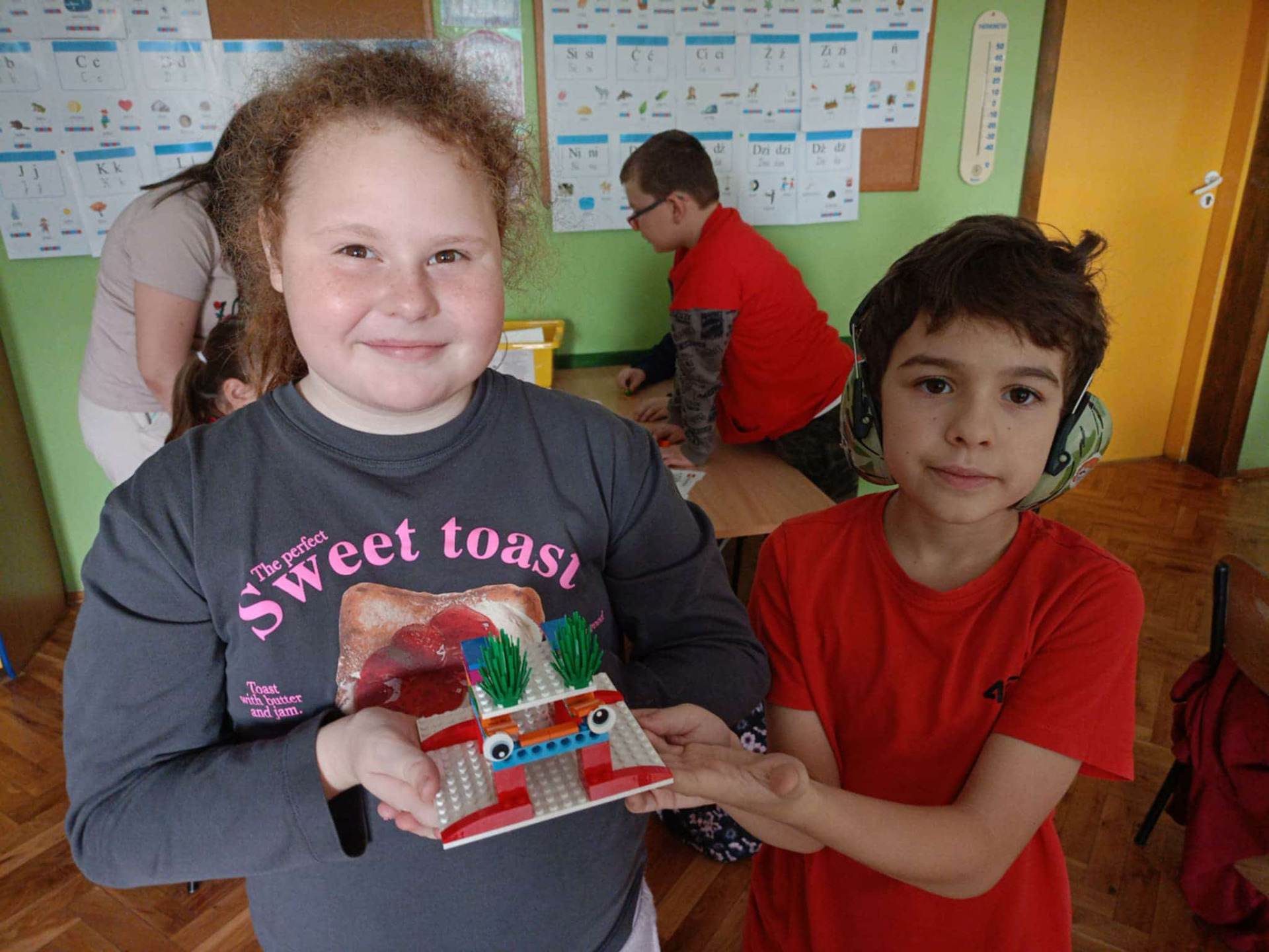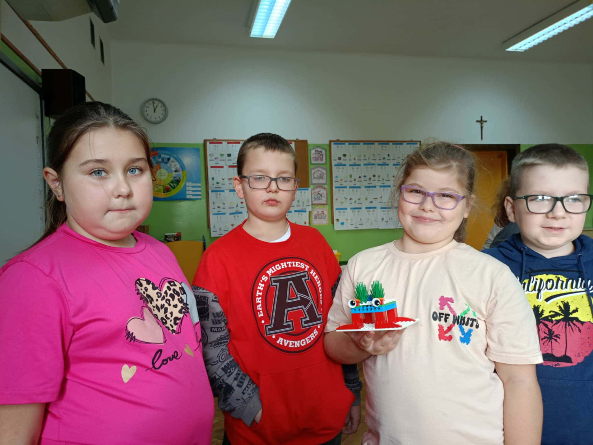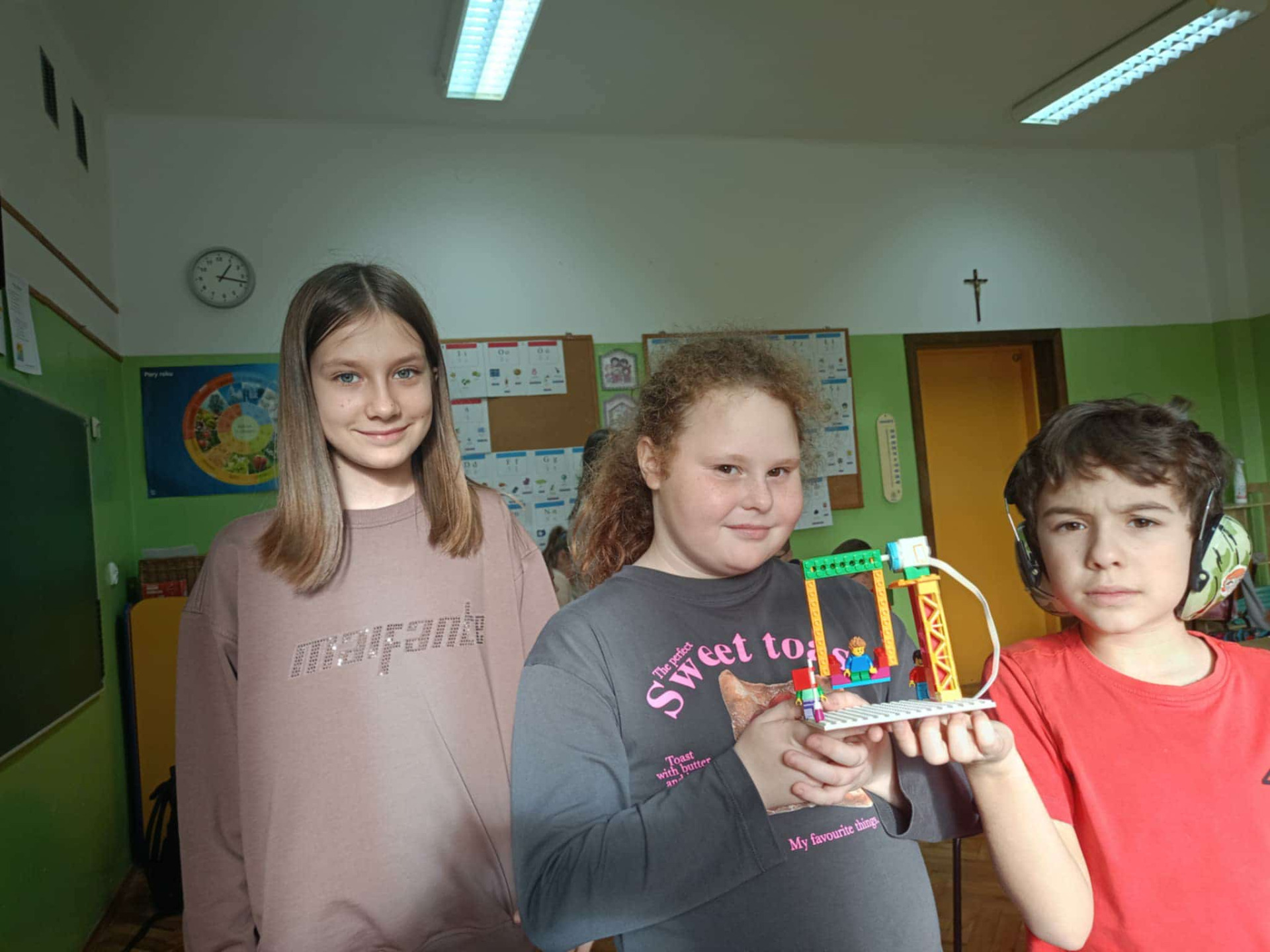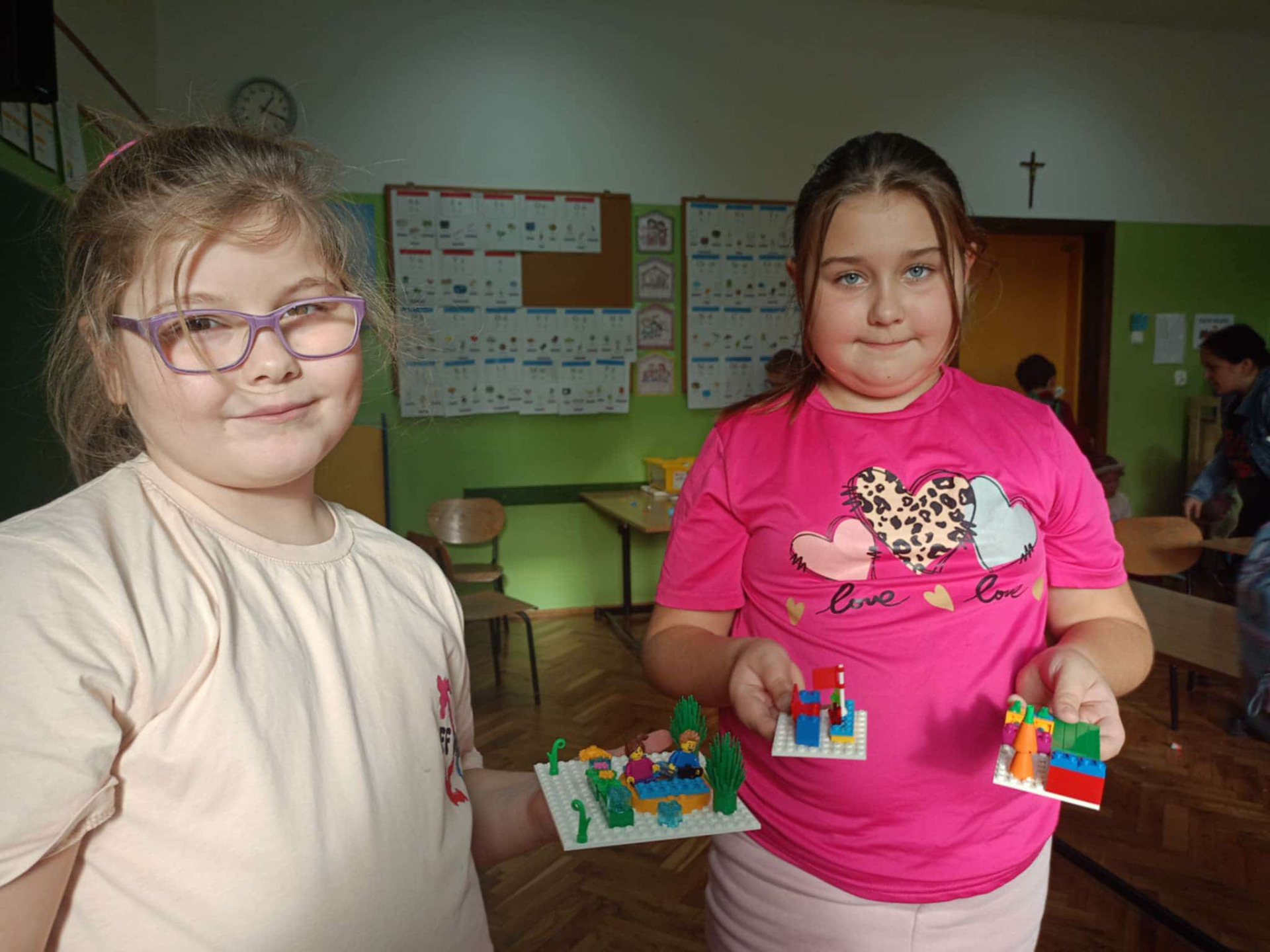 Uczennice klasy II pozują do zdjęcia i prezentują klocki.