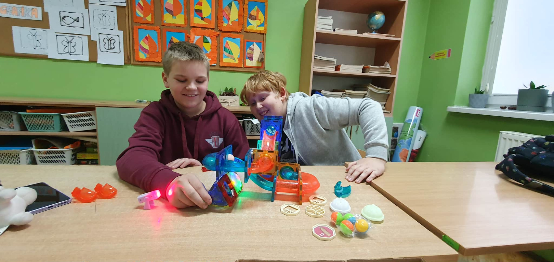 Uczniowie tworzą konstrukcje z klocków magnetycznych.