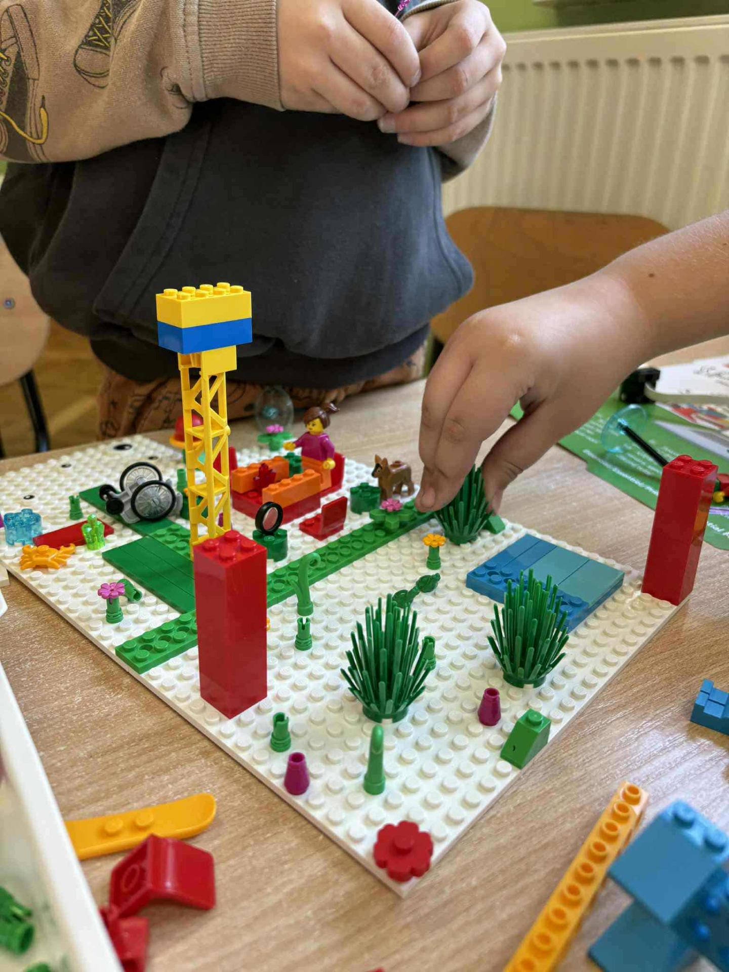 Praca uczniów zbudowana z klocków.