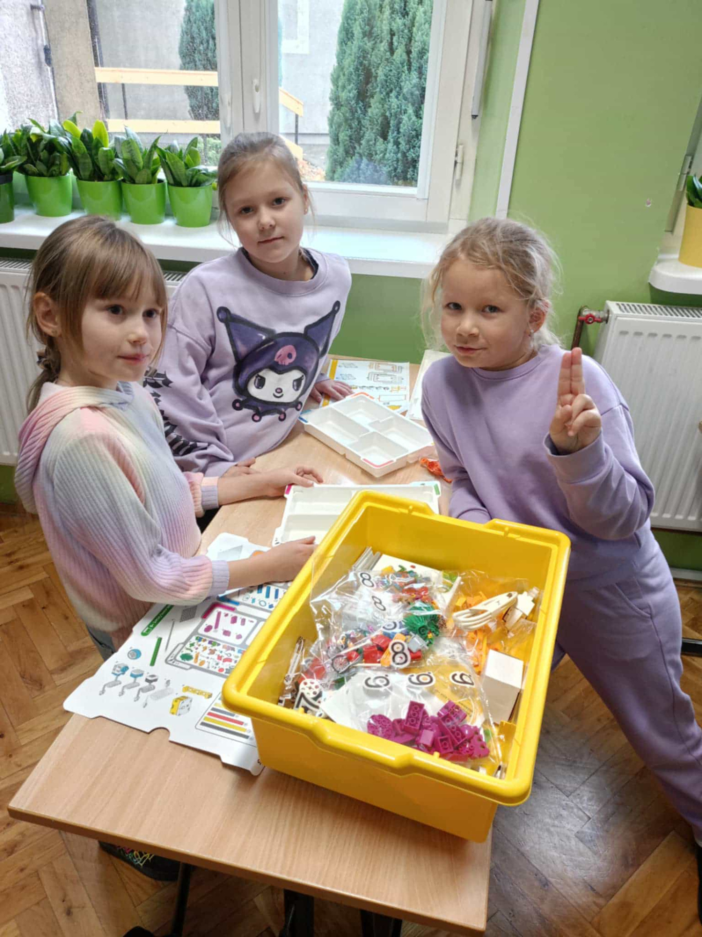 Uczennica czyta instrukcje, pozostałe dwie uczennice wybierają klocki potrzebne do konstrukcji..