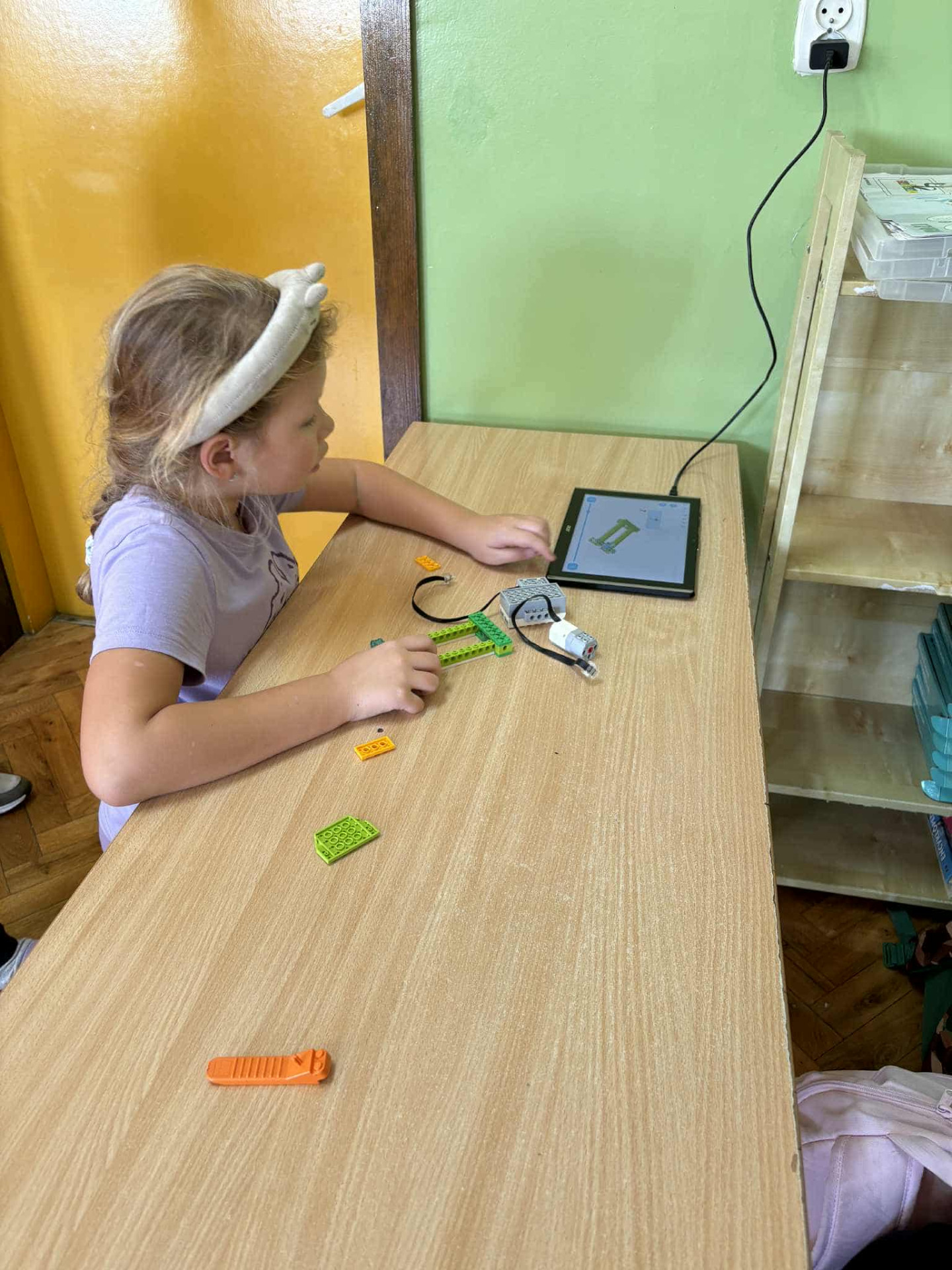 Uczennica buduje urządzenie korzystając z tabletu jako instrukcji.