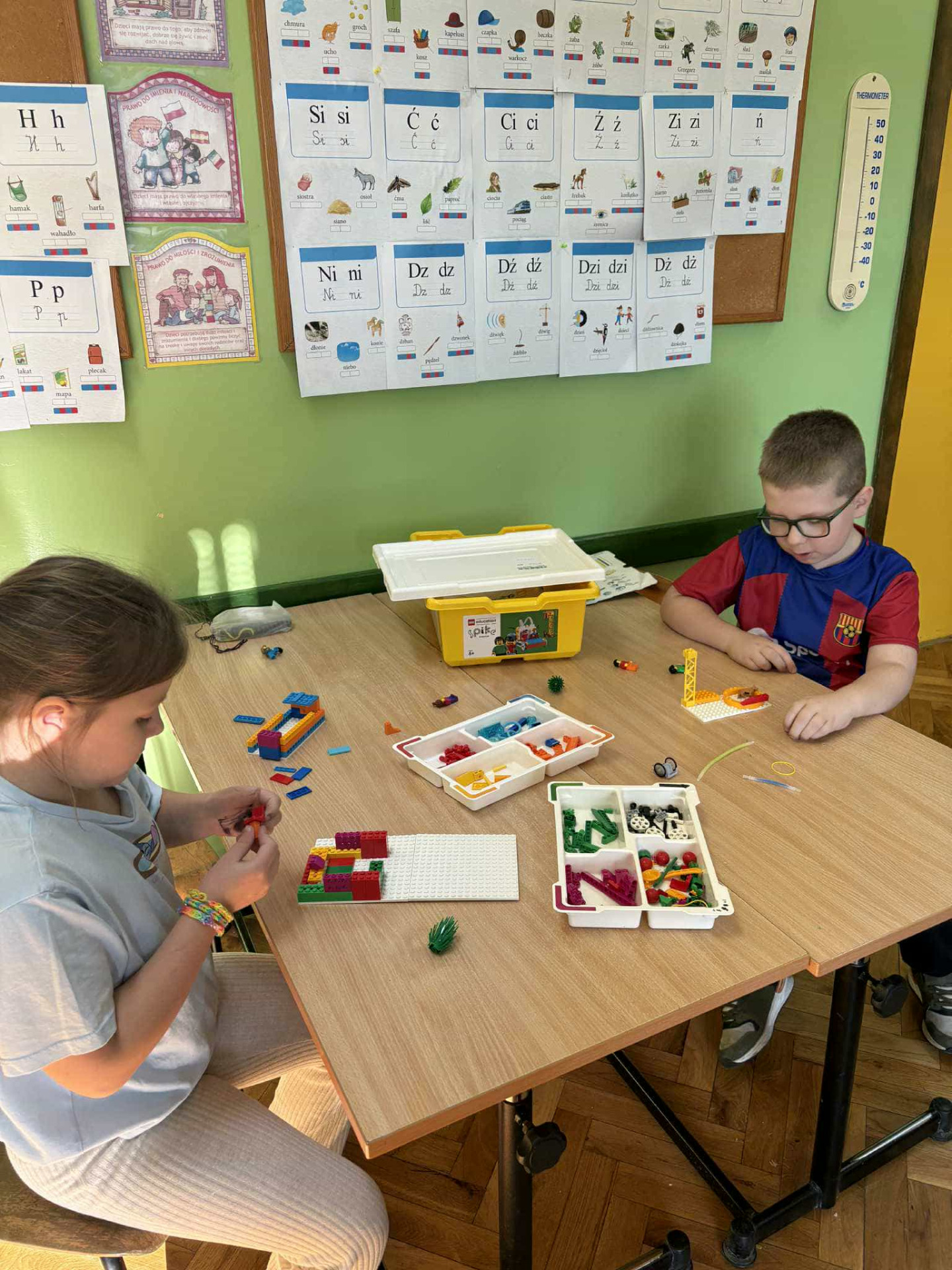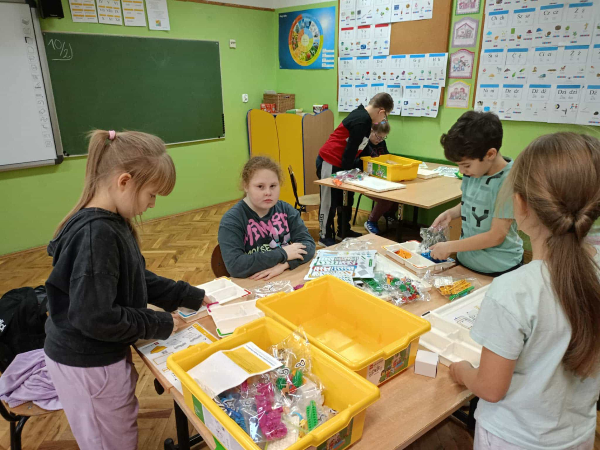 Uczniowie klasy II buduja budowlę z klocków.