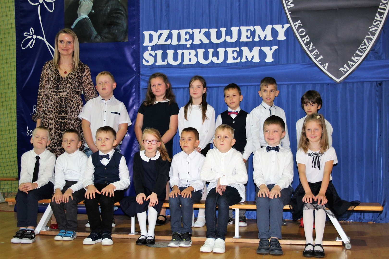 Następnie odbyła się oficjalna część, podczas której dzieci z klasy pierwszej zostały uroczyście pasowane na pierwszoklasistów. Uczniowie otrzymali legitymacje szkolne, elementarze oraz kuferki matematyczne.