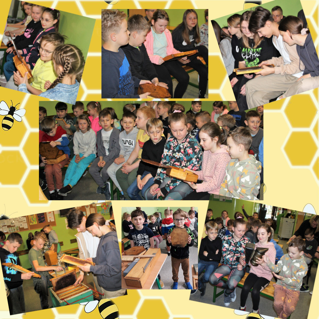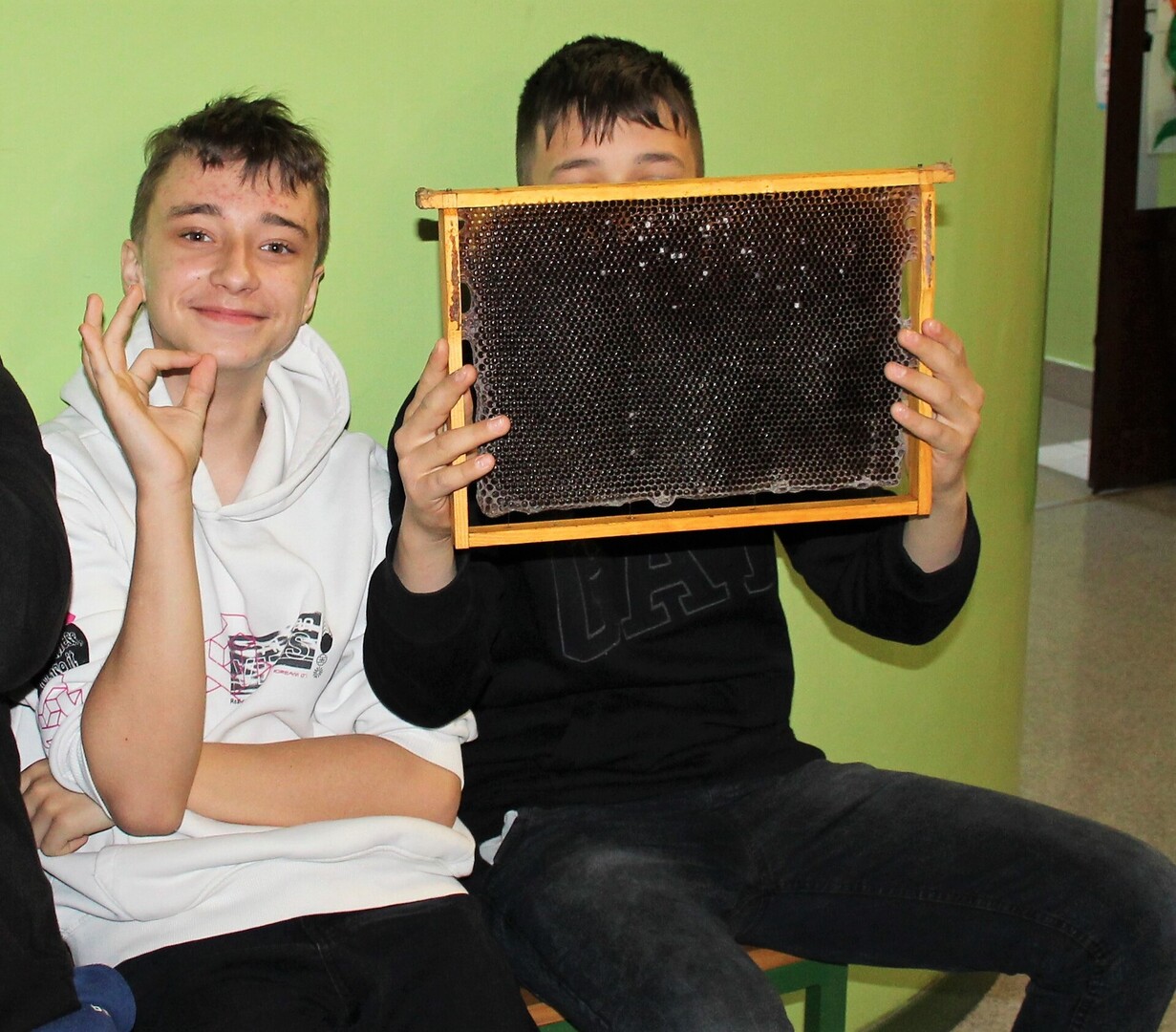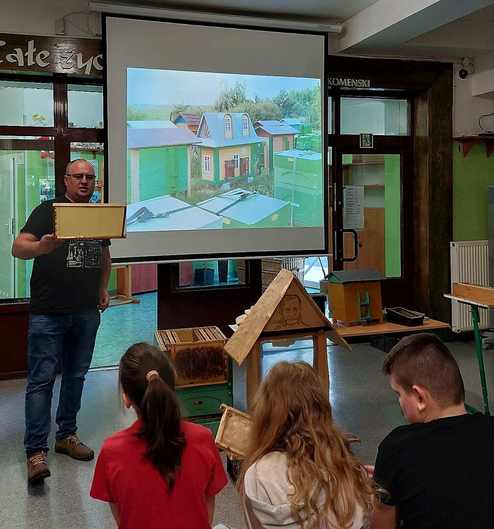 Poznali produkty jakie wytwarzają te niesamowite owady, takie jak: miód, mleczko pszczele, kit czy pierzga. Pan Wojciech przedstawił ich walory zdrowotne. Dodatkowo, zaproszony gość opowiedział o swojej pszczelarskiej pracy, która sprawia mu wielką radość i jest jego pasją. Ważnym aspektem spotkania była pogadanka dotycząca bezpieczeństwa człowieka w obecności owadów żądlących i zachowania po użądleniu. Pszczelarz poinstruował uczniów – jak postępować w sytuacji po ukąszeniu owadów. Zaprezentował liczne ciekawe eksponaty i fotografie związane z życiem pszczół i pracy w pasiece. Opowiedział wiele ciekawostek na temat życia pszczelej rodziny.