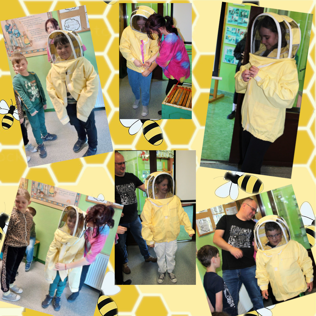 Dużą atrakcją było oglądanie akcesoriów pszczelarskich, m.in. prawdziwych ramek z woskiem pszczelim, miotełki, ula pokazowego, podkurzacza, wypalanych w drewnie historii z życia pszczół i wiele innych. Sporą ciekawość wzbudził strój pszczelarski, który był chętnie przymierzany przez naszych uczniów. Na koniec wizyty pszczelarz udzielił wyczerpujących odpowiedzi na liczne pytania.