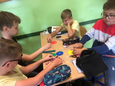Uczniowie klasy czwartej podczas lekcji matematyki chętnie korzystają z pomocy dydaktycznych zakupionych w ramach projektu „Laboratoria Przyszłości.