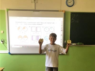W dniu 26.04.2023 r. omawiany był temat „Porównanie ułamków zwykłych”. Na początku młodzież porównywała części ułamkowe jabłka, następnie posługiwała się zestawami kół ułamkowych oraz animacjami. Elementy kół umożliwiły szybkie zrozumienie omawianego tematu.