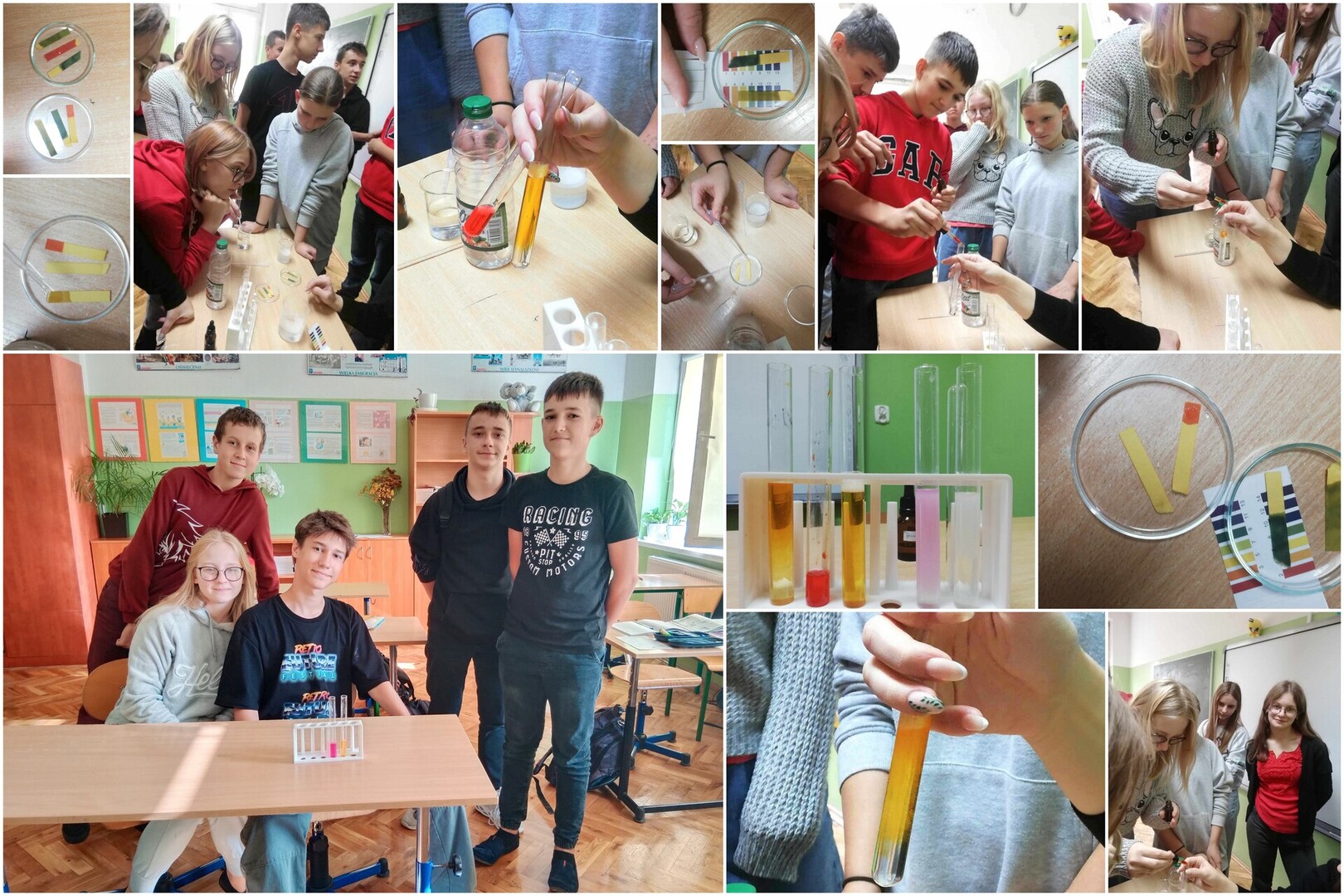 Jak najszybciej zapamiętać barwy wskaźników kwasowo - zasadowych? Zobaczyć wszystko własnym okiem podczas lekcji eksperymentalnej. Uczniowie klasy 8 w ramach omówienia zagadnień związanych z odczynem roztworu i skalą pH mieli okazję badać produkty spożywcze tj. ocet, cukier, kwasek cytrynowy i sodę oczyszczoną oraz środki czystości – mydło i proszek do prania. Mamy nadzieję, że zaobserwowane różne barwy w probówkach i na szalkach Petriego na długo zostaną w pamięci naszych uczniów.