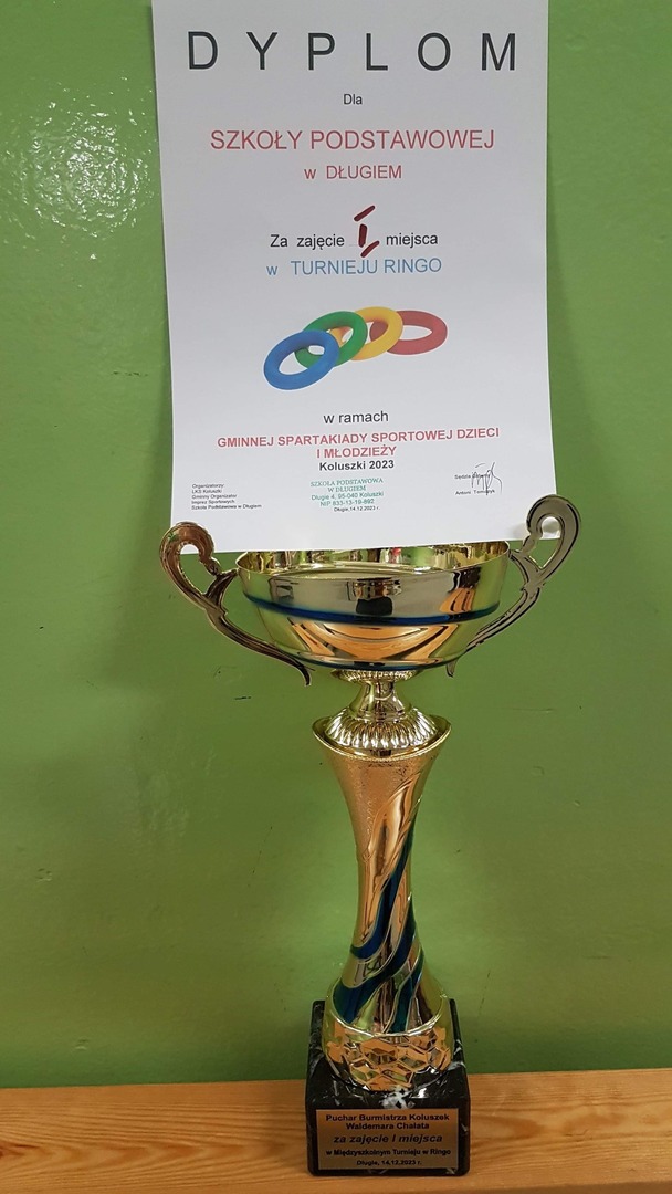 W dniu dzisiejszym w naszej szkole został rozegrany „Gminny Turniej Ringo”. Do rywalizacji stanęło 6 drużyn: SP nr 1, SP nr 2, SP Różyca, SP Będzelin, SP Gałkówek i oczywiście SP Długie. Turniej został rozegrany systemem każdy z każdym. Nasi uczniowie dali z siebie wszystko i dzielnie walczyli w każdym meczu. Nasza drużyna wygrała wszystkie mecze i zajęła I miejsce! Skład zwycięskiej drużyny: Maja Jóźwik, Karolina Frączak, Julia Matusiak, Gabriela Kobus, Marcel Rybiński, Bartłomiej Matusiak, Jakub Krawczyk i Andrzej Szklarek.