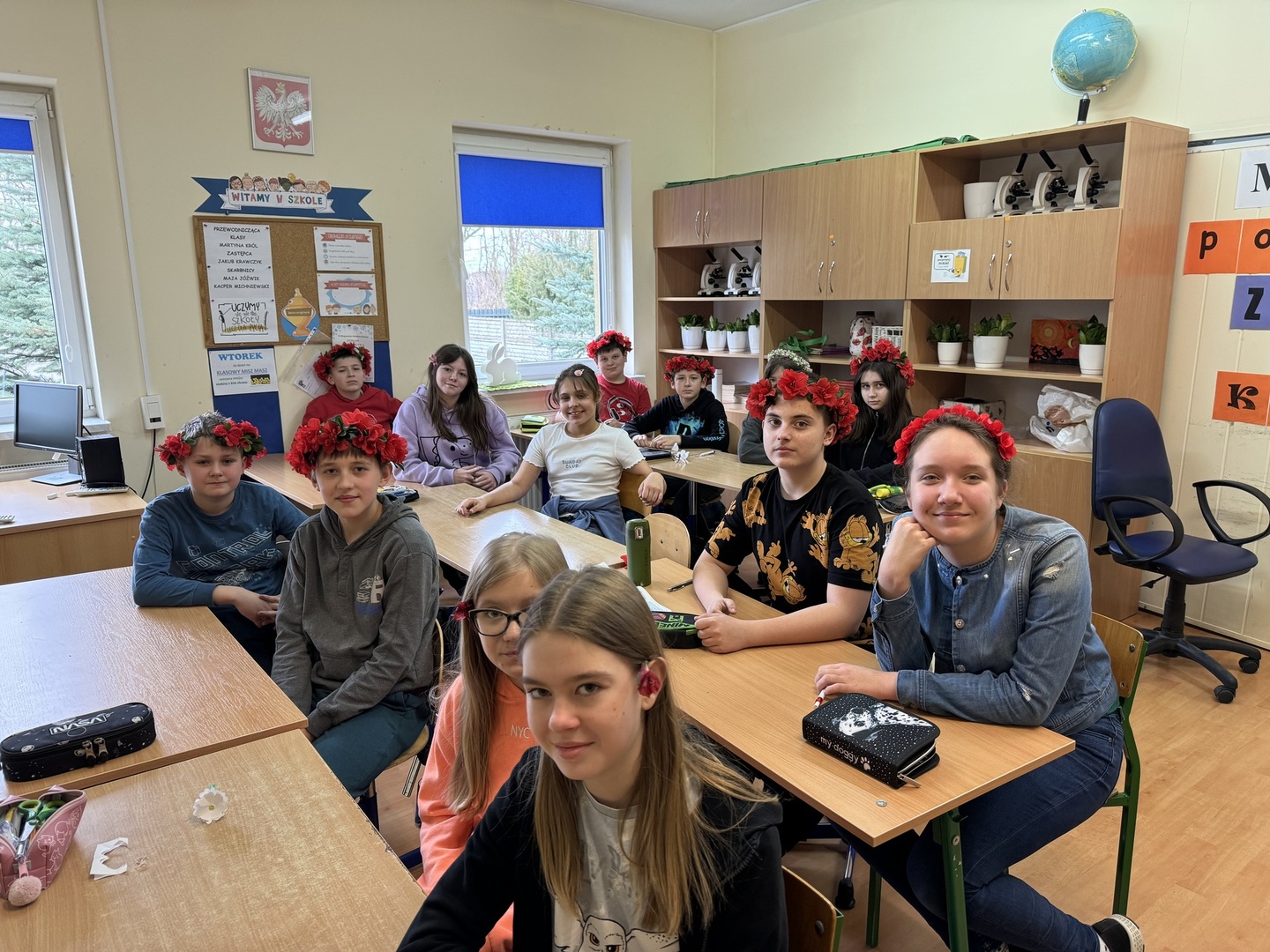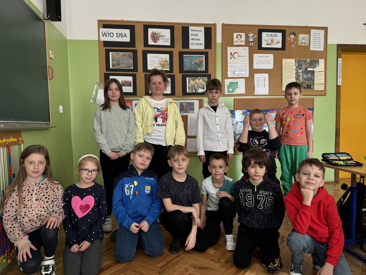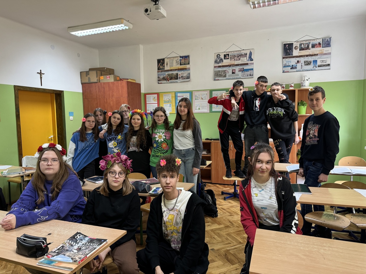 W dniach od 18 do 22 marca w naszej szkole uczniowie przygotowywali się na nadejście wiosny. Każdego dnia podejmowali wyzwanie związane z zabawą przygotowaną przez Samorząd Uczniowski. I tak w poniedziałek królowały kwiaty we włosach, wtorek to dzień postaci z bajek, środa była dniem w kropki, czwartek dniem zielonym, a w piątek uczniowie świętowali nadejście wiosny w dresie.