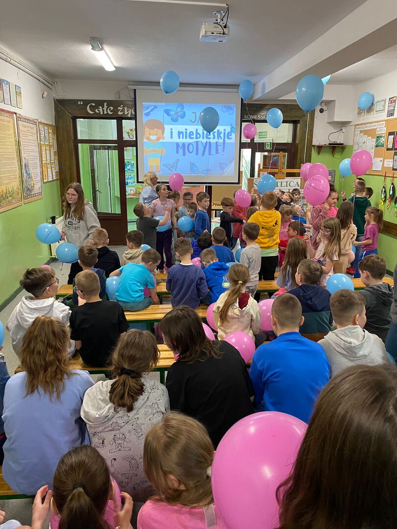 W dniu 2 kwietnia obchodzimy Światowy Dzień Świadomości Autyzmu . W dniu 3 kwietnia w naszej szkole uczniowie założyli ubrania w kolorze różowym i niebieskim, aby pokazać, że autyzm nie ma płci. W tym dniu wspieramy wszystkich jednakowo.