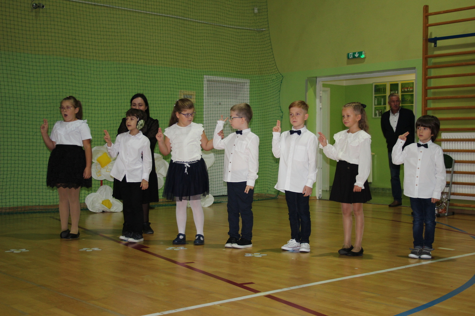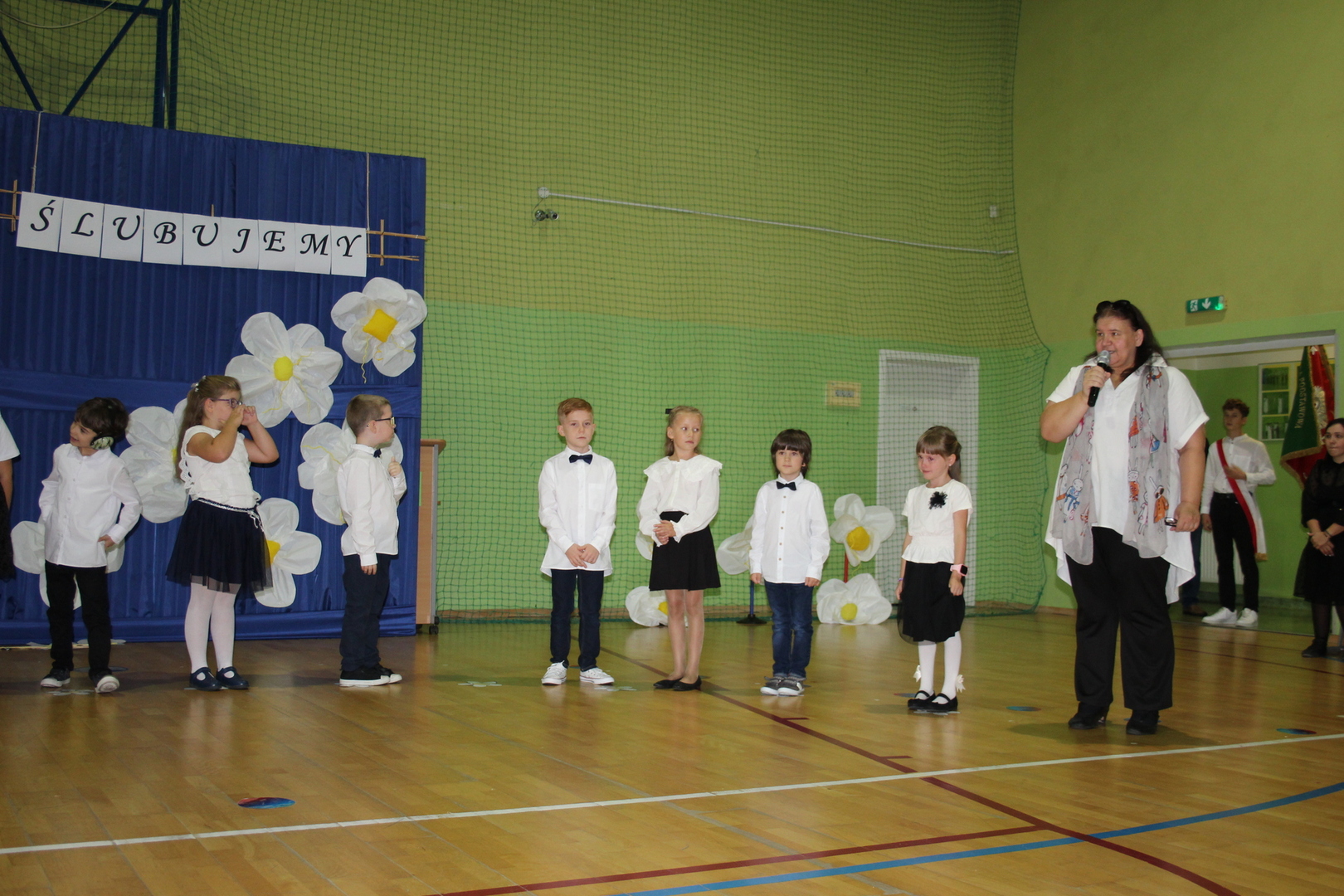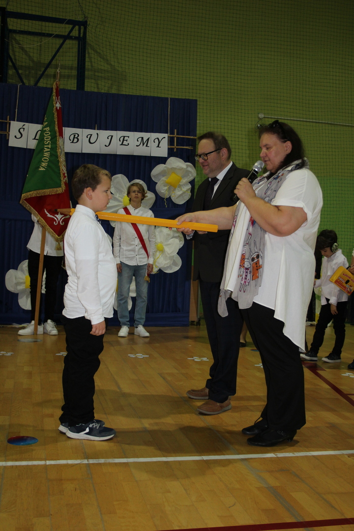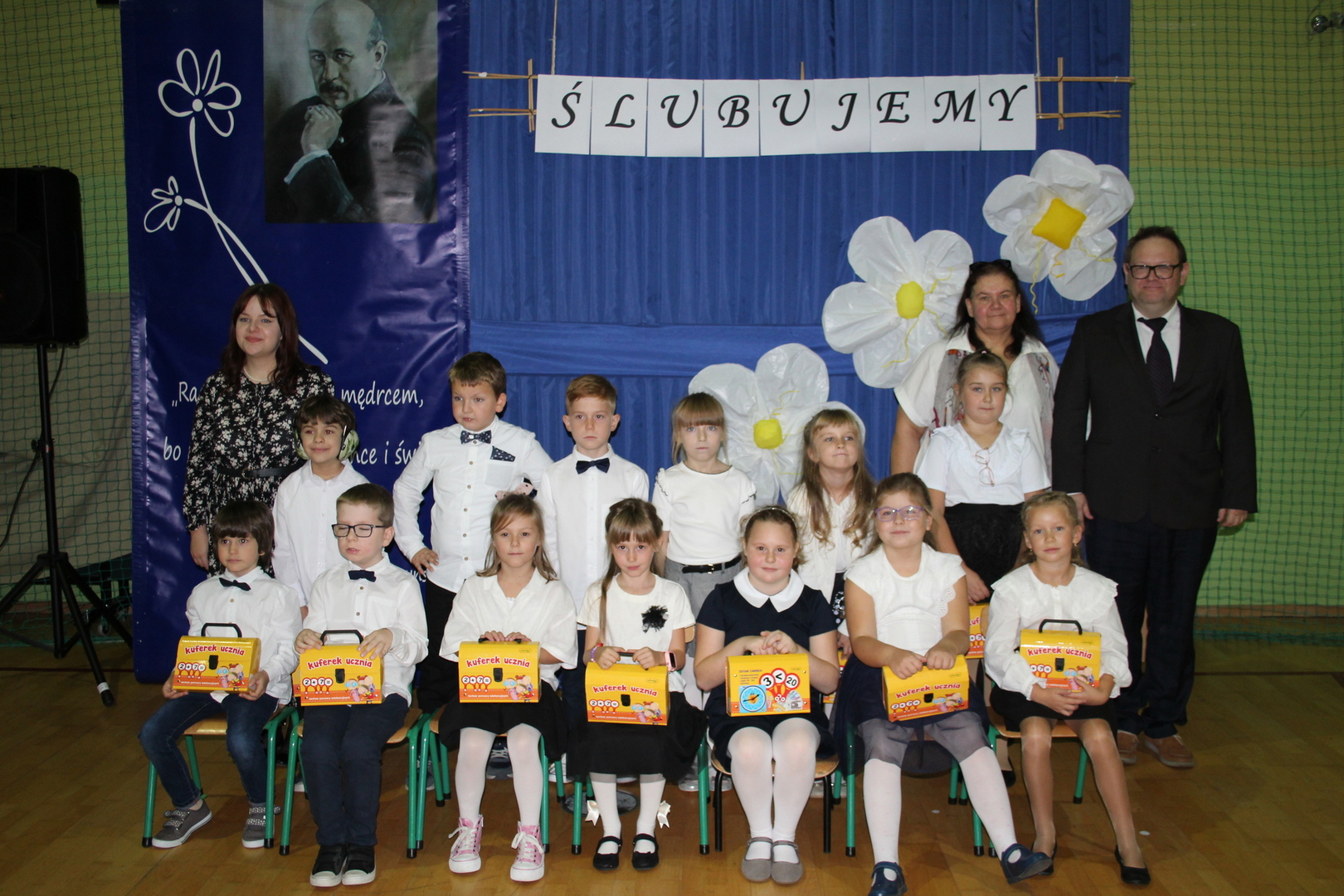 Dnia 9 październik w naszej szkole odbyła się uroczystość pasowania na ucznia połączona z obchodami Dnia Edukacji Narodowej. W trakcie uroczystości dzieci pokazały, że potrafią pięknie śpiewać i recytować. W obecności całej społeczności szkolnej, Dyrektor Szkoły Joanna Jeżyna wraz z Zastępcą Burmistrza Koluszek panem Tomaszem Krawczykiem przyjęli pierwszoklasistów do grona uczniów. Dzieci głośno przyrzekały być dobrymi i pilnymi uczniami oraz rzetelnie wypełniać swoje obowiązki.