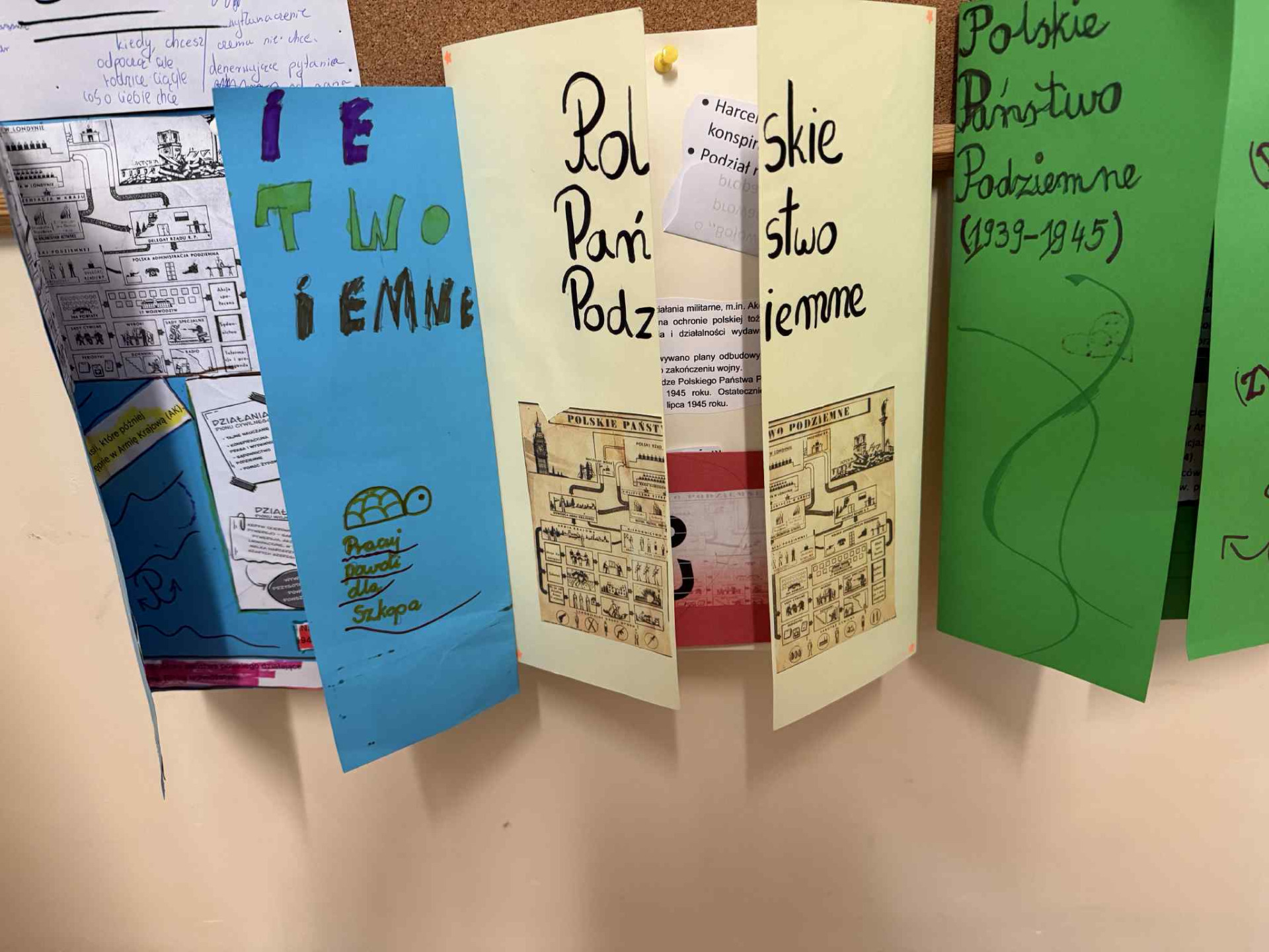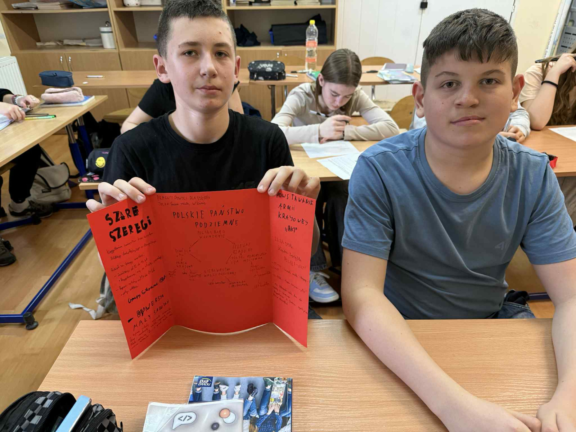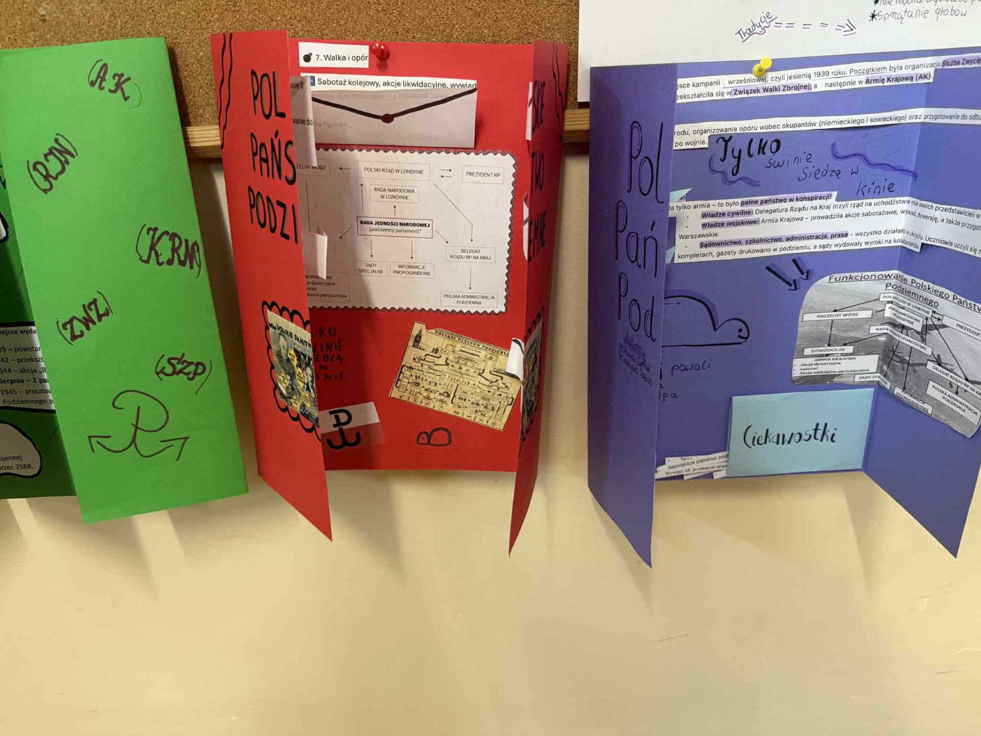 Uczniowie polaczeni w pary przygotowywali lapbooki dotyczące Polskiego Państwa Podziemnego. Lapbook na lekcji historii to interaktywna, teczkowa forma pracy, w której uczniowie gromadzą informacje o wybranym temacie za pomocą kieszonek, zakładek, rysunków, zdjęć, historyjek i wykresów. Jest to kreatywny sposób na zastąpienie tradycyjnych notatek, utrwalenie wiedzy i rozwijanie kreatywności uczniów.
