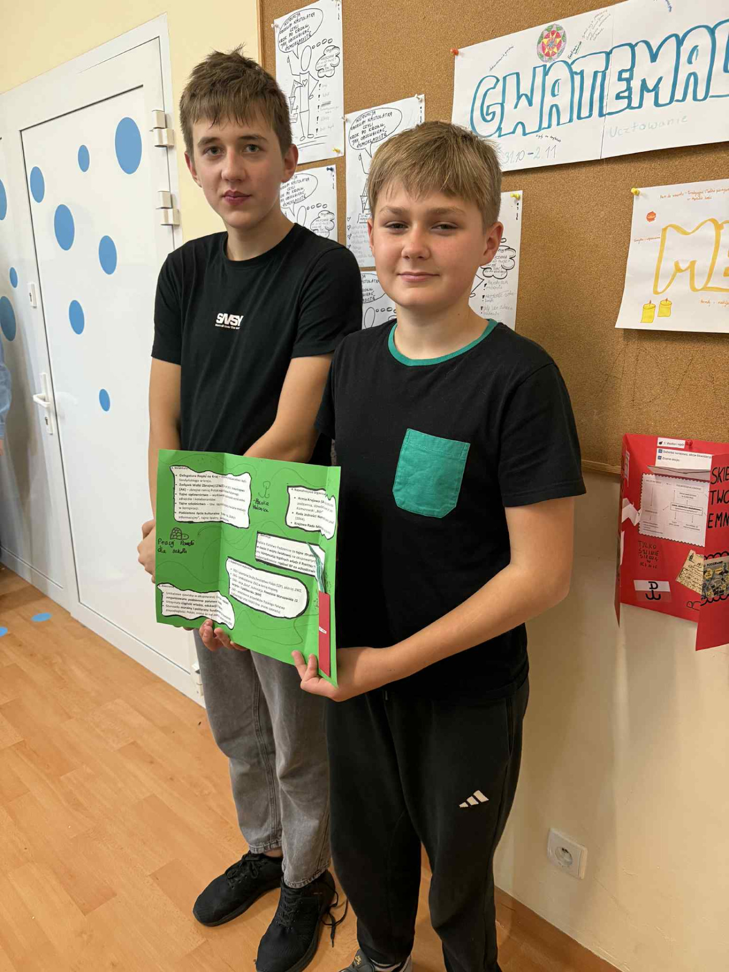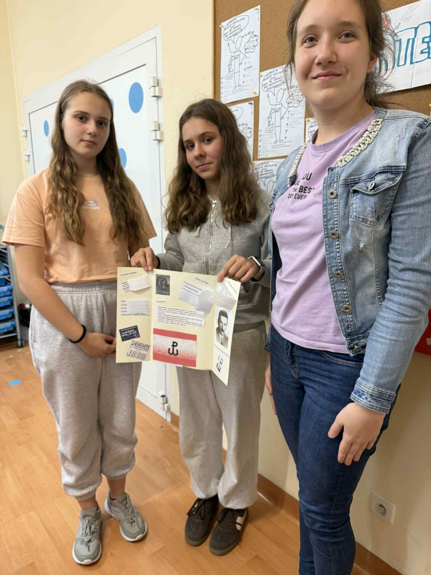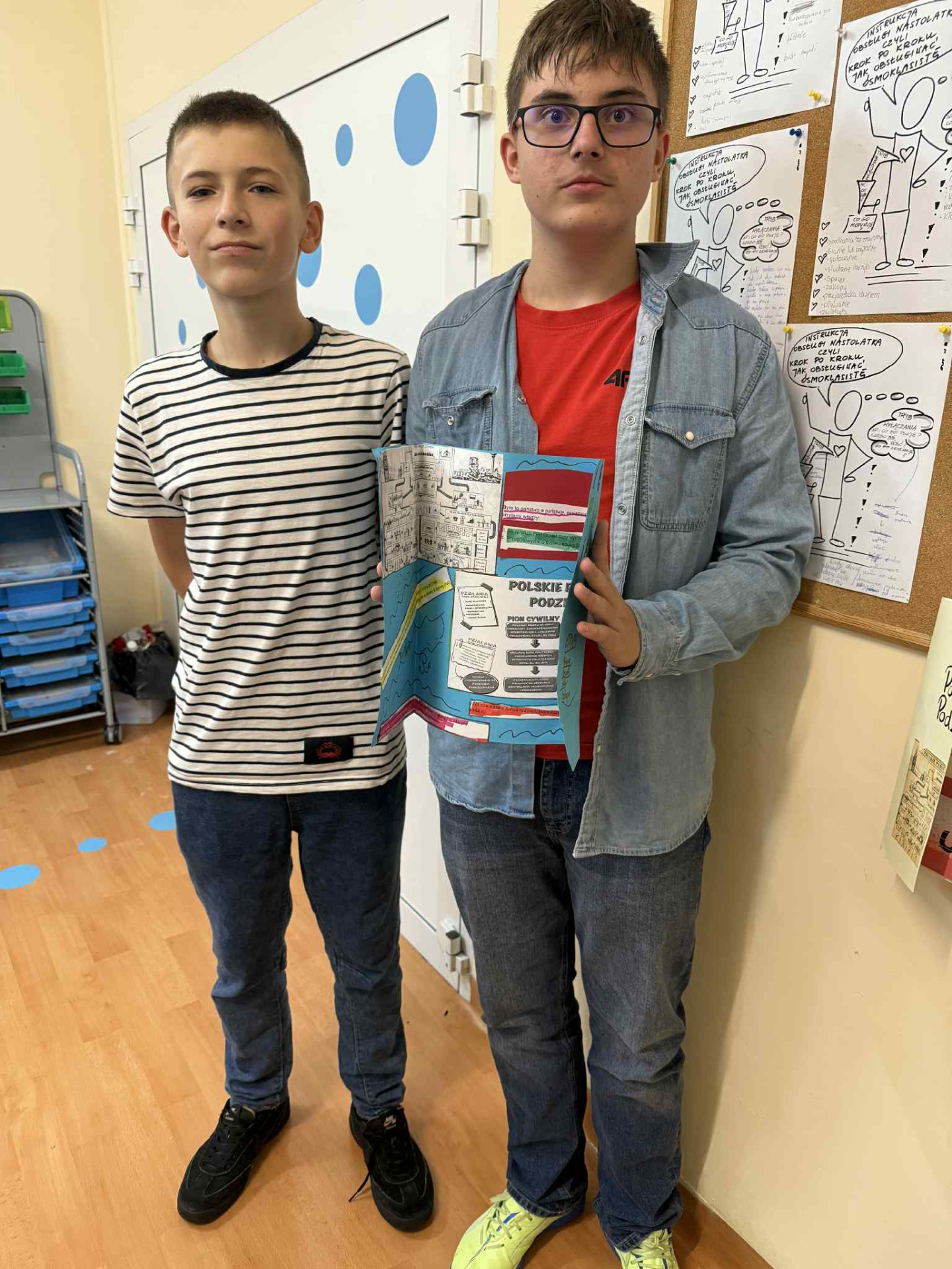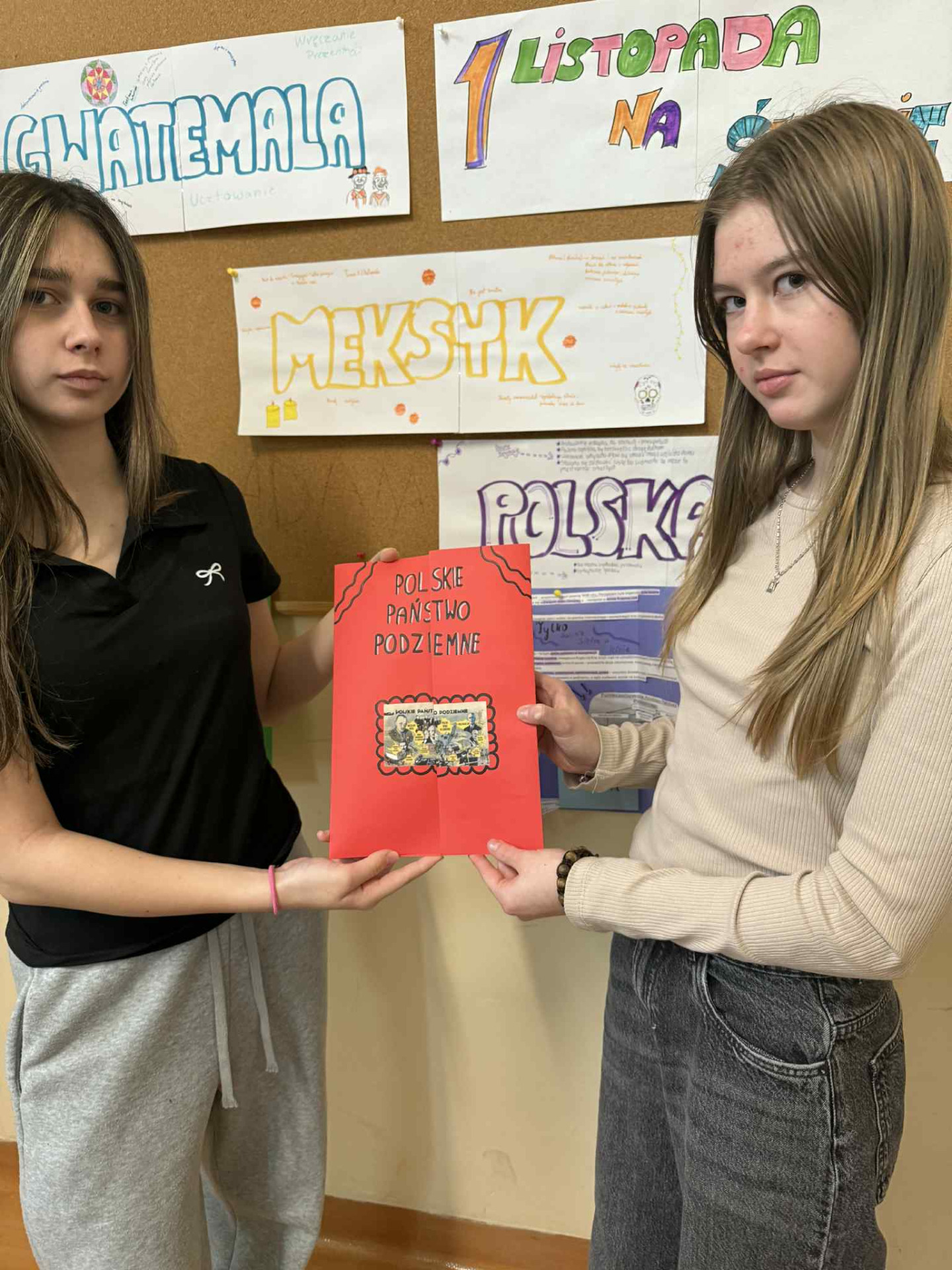 Uczniowie polaczeni w pary przygotowywali lapbooki dotyczące Polskiego Państwa Podziemnego. Lapbook na lekcji historii to interaktywna, teczkowa forma pracy, w której uczniowie gromadzą informacje o wybranym temacie za pomocą kieszonek, zakładek, rysunków, zdjęć, historyjek i wykresów. Jest to kreatywny sposób na zastąpienie tradycyjnych notatek, utrwalenie wiedzy i rozwijanie kreatywności uczniów.
