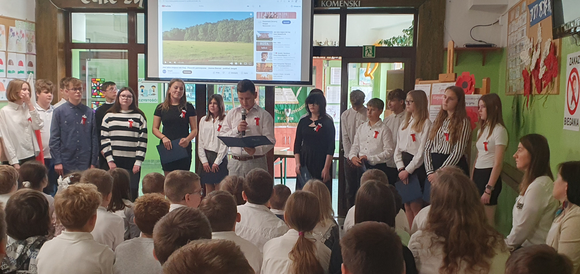 Uroczyste obchody zbliżającego się Święta Niepodległości w naszej szkole miały miejsce w minioną środę. Szkolny korytarz przybrał odświętny biało - czerwony wystrój. Uczniowie w eleganckich strojach i z ogromnym zaangażowaniem zaprezentowali montaż słowno - muzyczny, który we wzruszający sposób ukazał drogę, jaką nasza ojczyzna musiała przejść by zyskać upragnioną wolność. Siódmoklasiści pod kierunkiem nauczycielki historii pani Marty Lewandowskiej oraz dzięki wsparciu chóru przygotowanego przez panią Martę Koszacką przypomnieli ciężki czas zaborów oraz piękne patriotyczne pieśni m.in. Rotę, która wzruszyła zebranych.