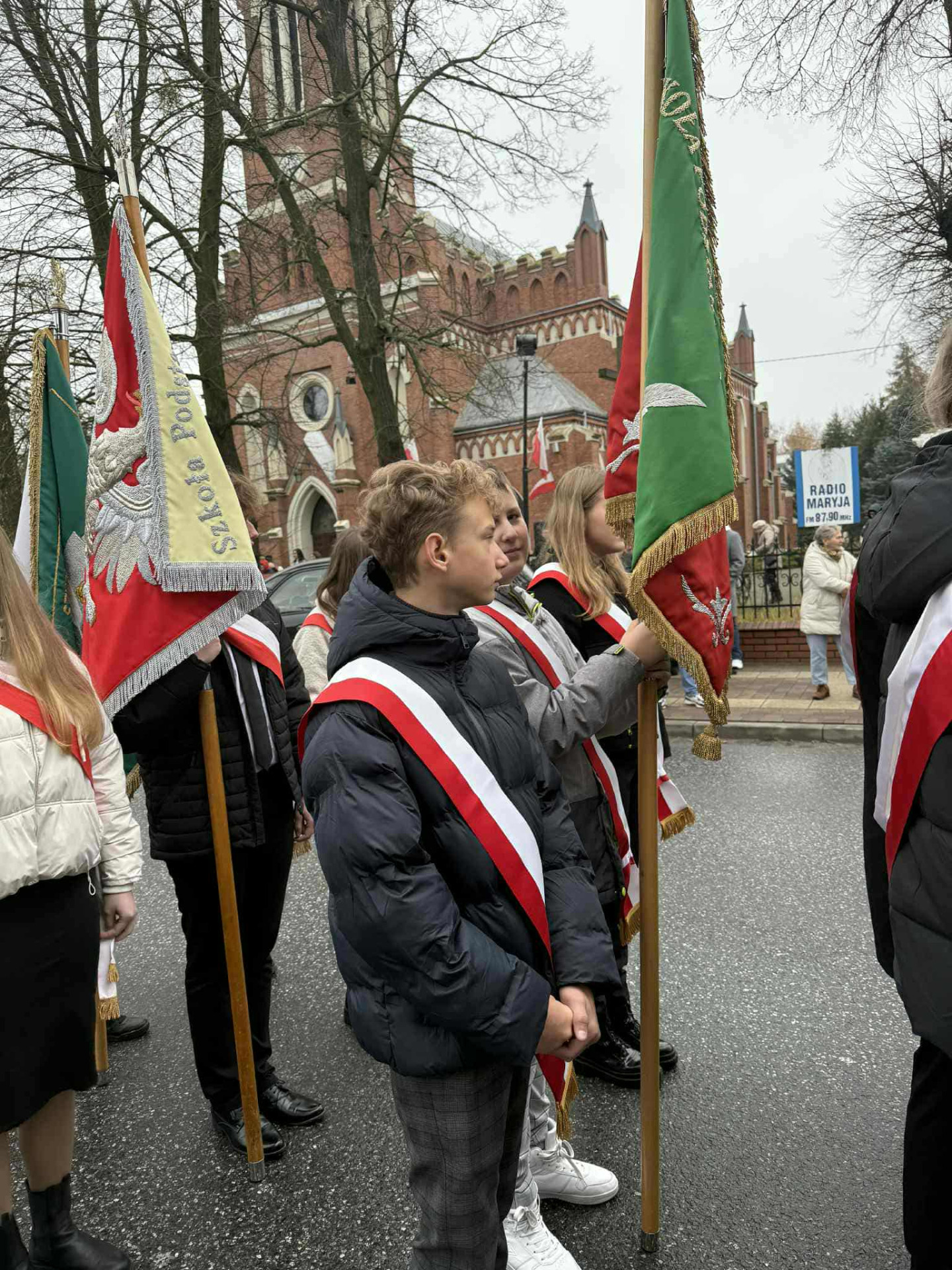 Jak co roku 11 listopada w Święto Niepodległości nasz poczet sztandarowy w składzie: Julia Matusiak, Aleksandra Miśkiewicz, Bartłomiej Matusiak oraz Michał Marczyk wraz z opiekunem panią Martą Lewandowską uczestniczył w obchodach tego jakże ważnego święta państwowego. Na uwagę zasługuje fakt, że w uroczystościach brali również inni uczniowie naszej szkoły, którzy z własnej chęci chcieli świętować ten wyjątkowy dzień. Rozpoczął się on mszą świętą w kościele Niepokalanego Poczęcia Najświętszej Marii Panny w Koluszkach a po niej ruszył pochód pod pomnik Orła Białego gdzie nastąpiła dalsza część uroczystości.