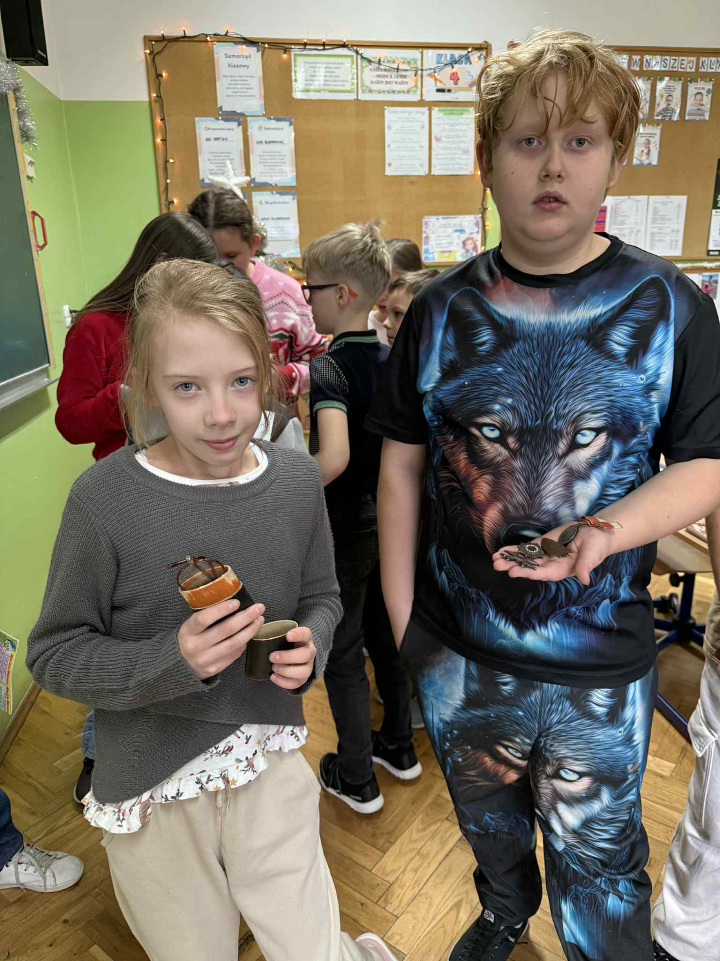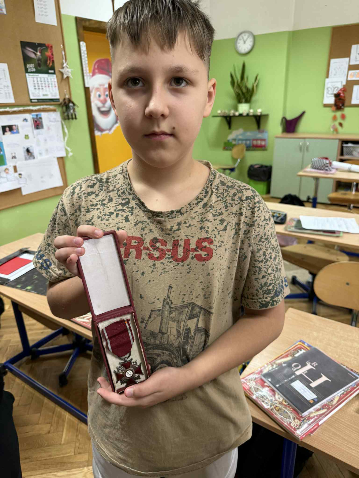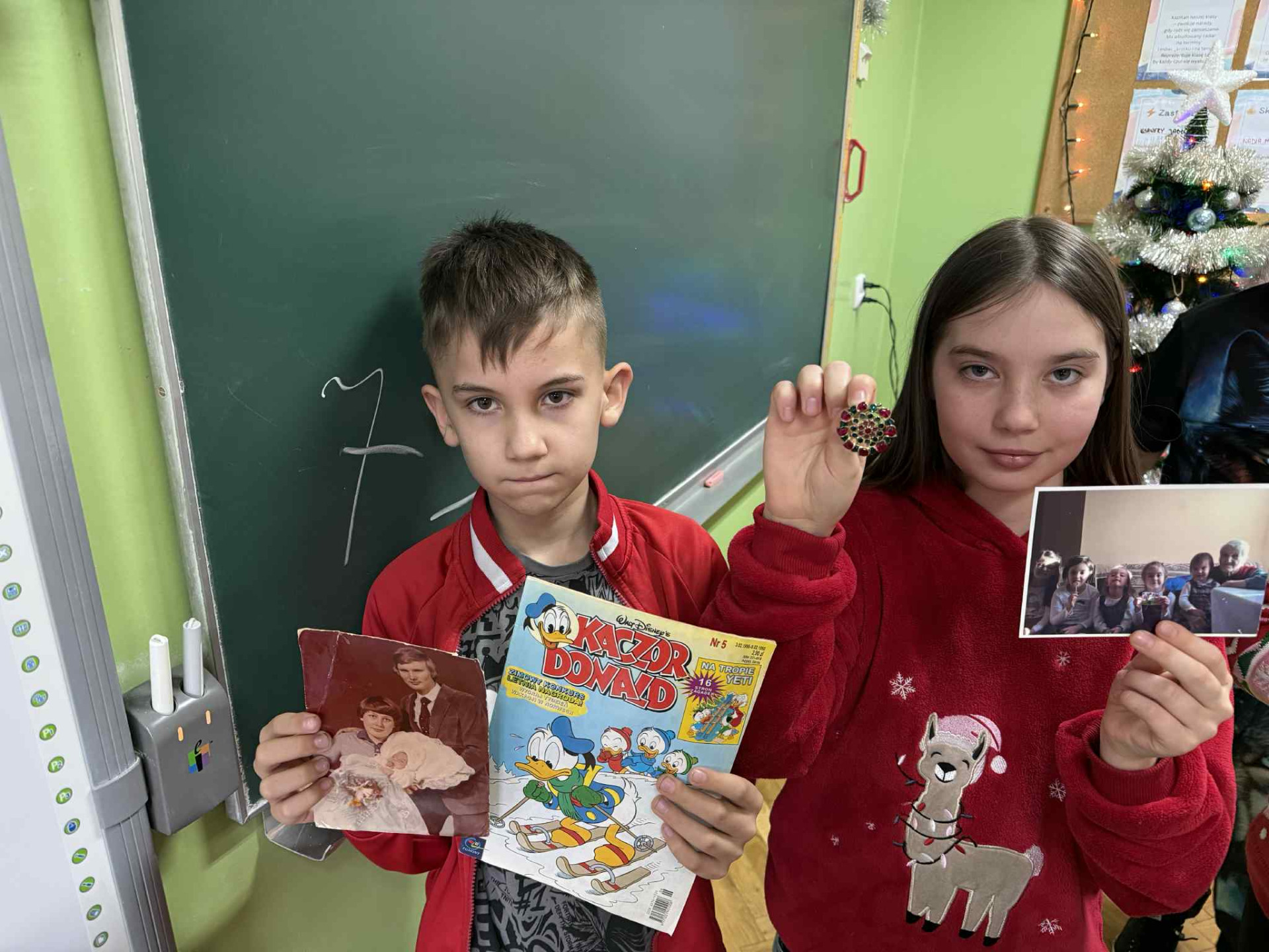 W poniedziałek uczniowie klasy czwartej omawiali temat dotyczący pamiątek rodzinnych. Przynieśli dziś do szkoły bardzo ciekawe i czasem już zabytkowe przedmioty będące częścią historii ich rodzin. Mogliśmy dziś obejrzeć bardzo stare zdjęcia, pięknie wykonane broszki, okulary przywiezione wiele lat temu z zagranicy, mnóstwo monet z czasów PRL oraz medale i odznaczenia z minionego wieku. Każdy mógł ich dotknąć i posłuchać do kogo należały. To była ciekawa lekcja historii.